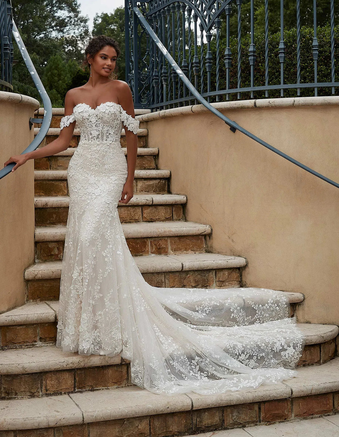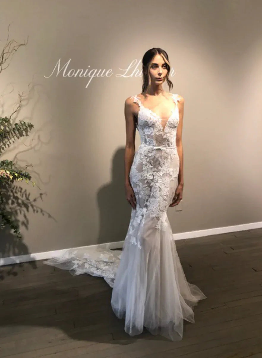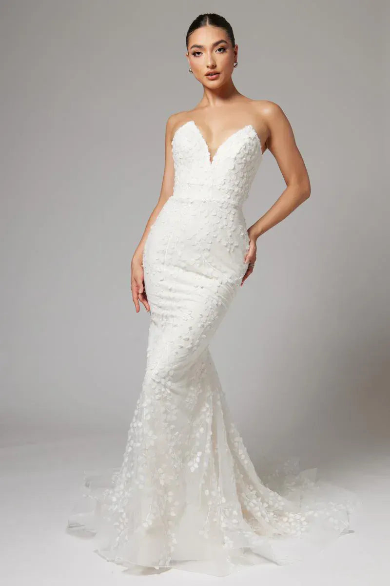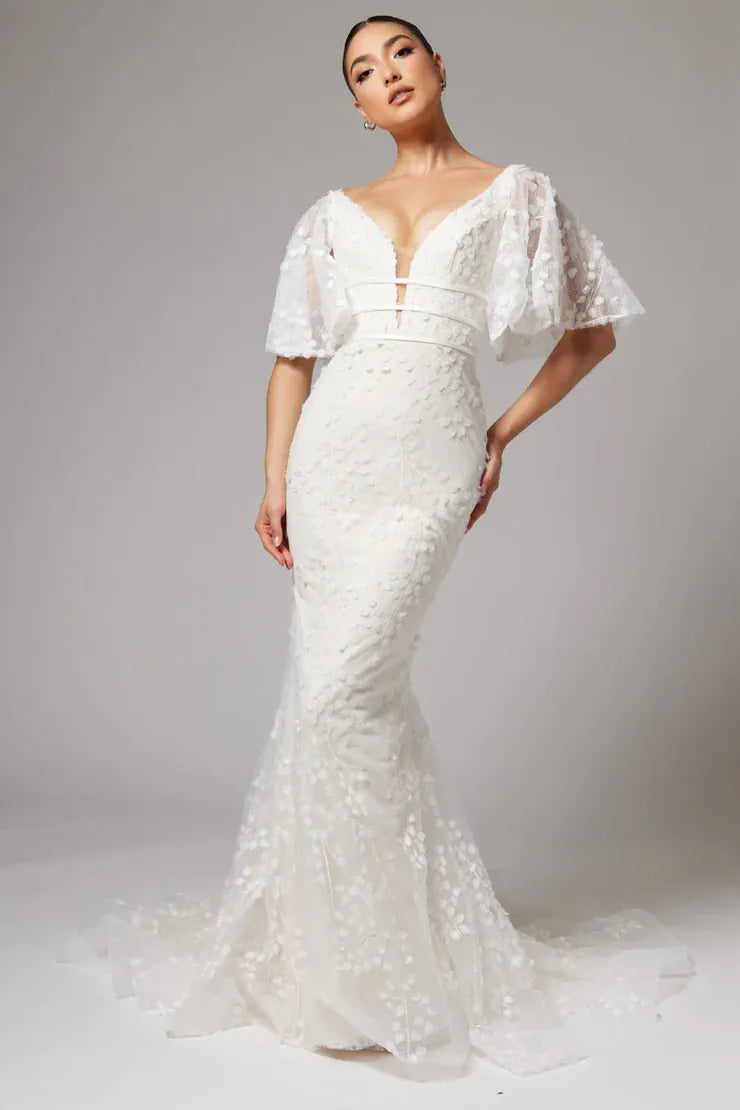 Our wedding gowns are crafted to celebrate your unique beauty. With a variety of necklines, including deep-plunge, V-neck, and off the shoulder styles, you're sure to find a fit and flare wedding dress that complements your personal taste. The fitted bodice hugs your curves before gracefully flaring out at the knee or thigh, creating a romantic and feminine look that's perfect for walking down the aisle.