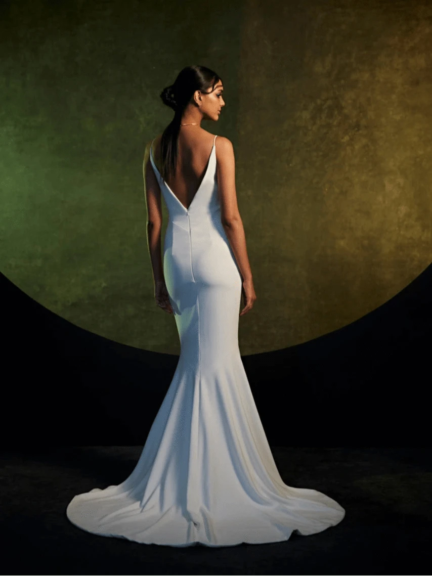Our wedding gowns are crafted to celebrate your unique beauty. With a variety of necklines, including deep-plunge, V-neck, and off the shoulder styles, you're sure to find a fit and flare wedding dress that complements your personal taste. The fitted bodice hugs your curves before gracefully flaring out at the knee or thigh, creating a romantic and feminine look that's perfect for walking down the aisle.