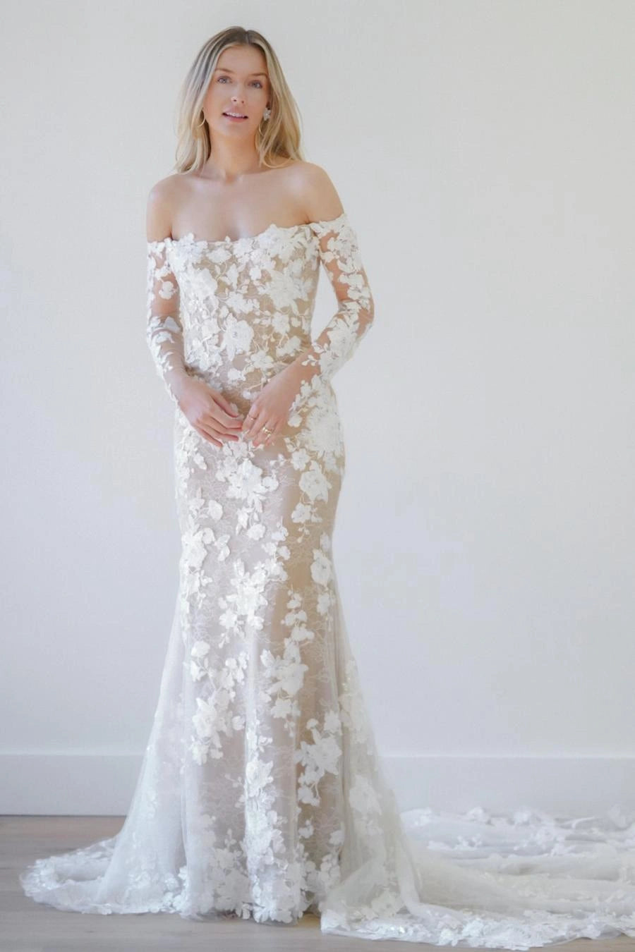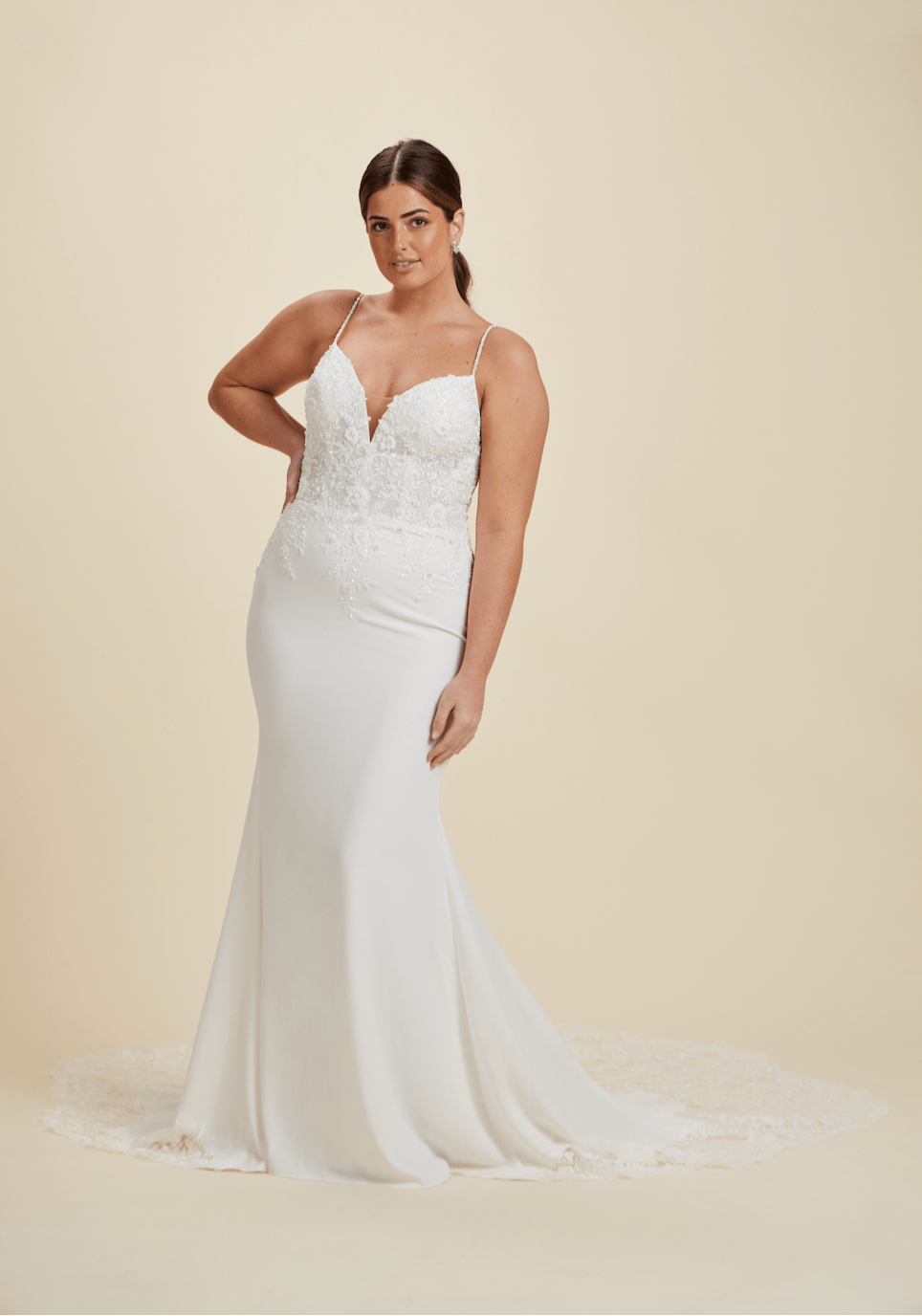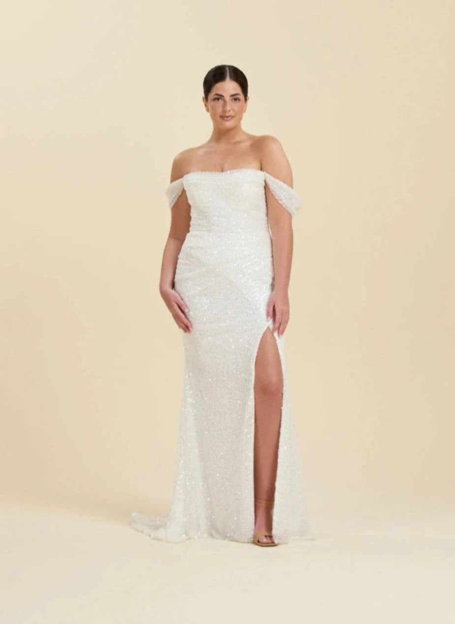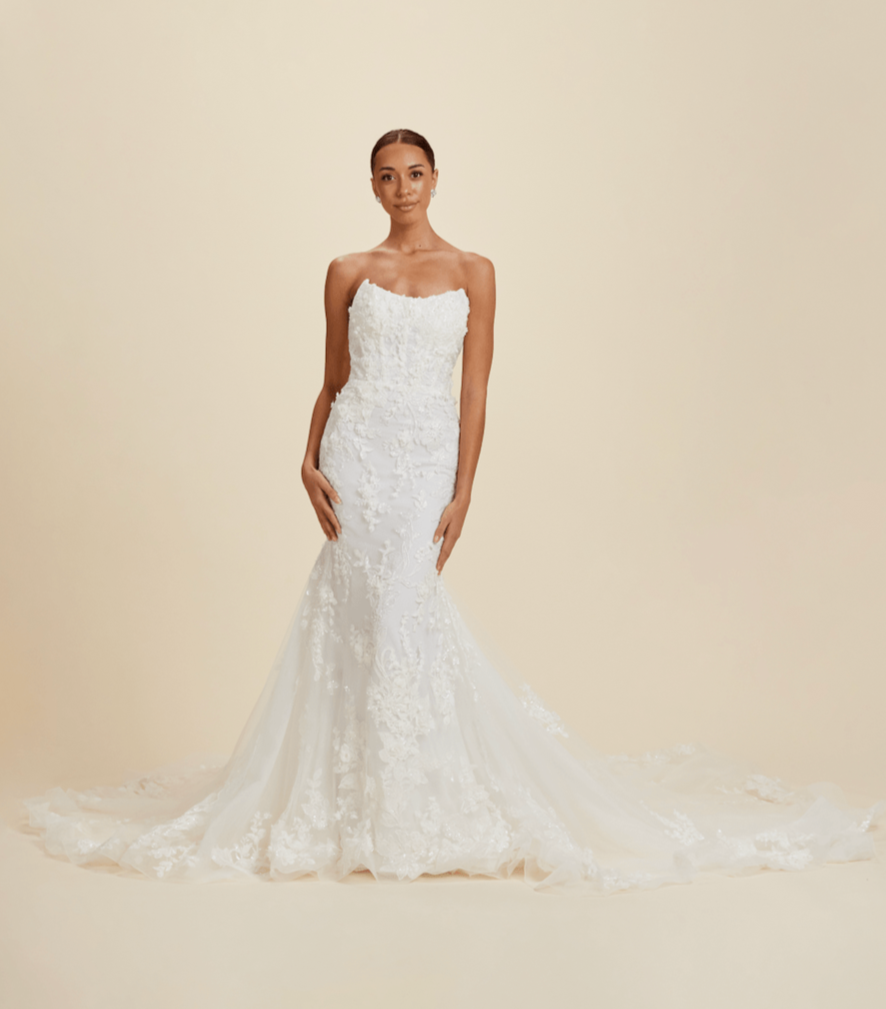 Our wedding gowns are crafted to celebrate your unique beauty. With a variety of necklines, including deep-plunge, V-neck, and off the shoulder styles, you're sure to find a fit and flare wedding dress that complements your personal taste. The fitted bodice hugs your curves before gracefully flaring out at the knee or thigh, creating a romantic and feminine look that's perfect for walking down the aisle.