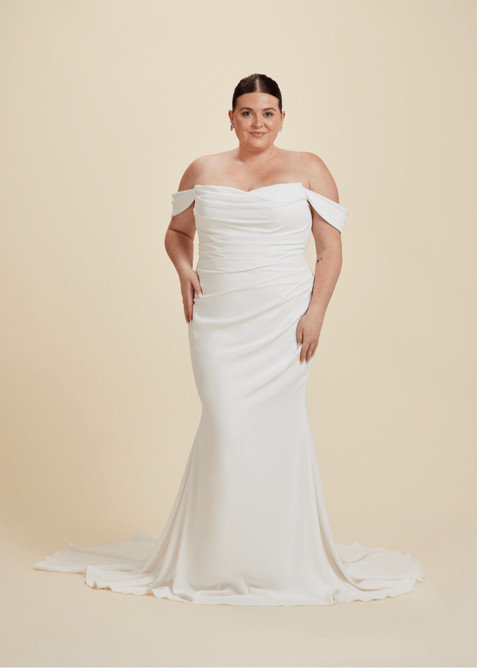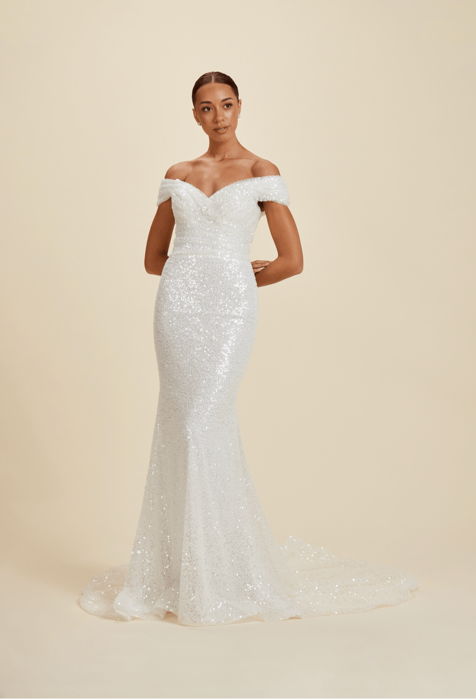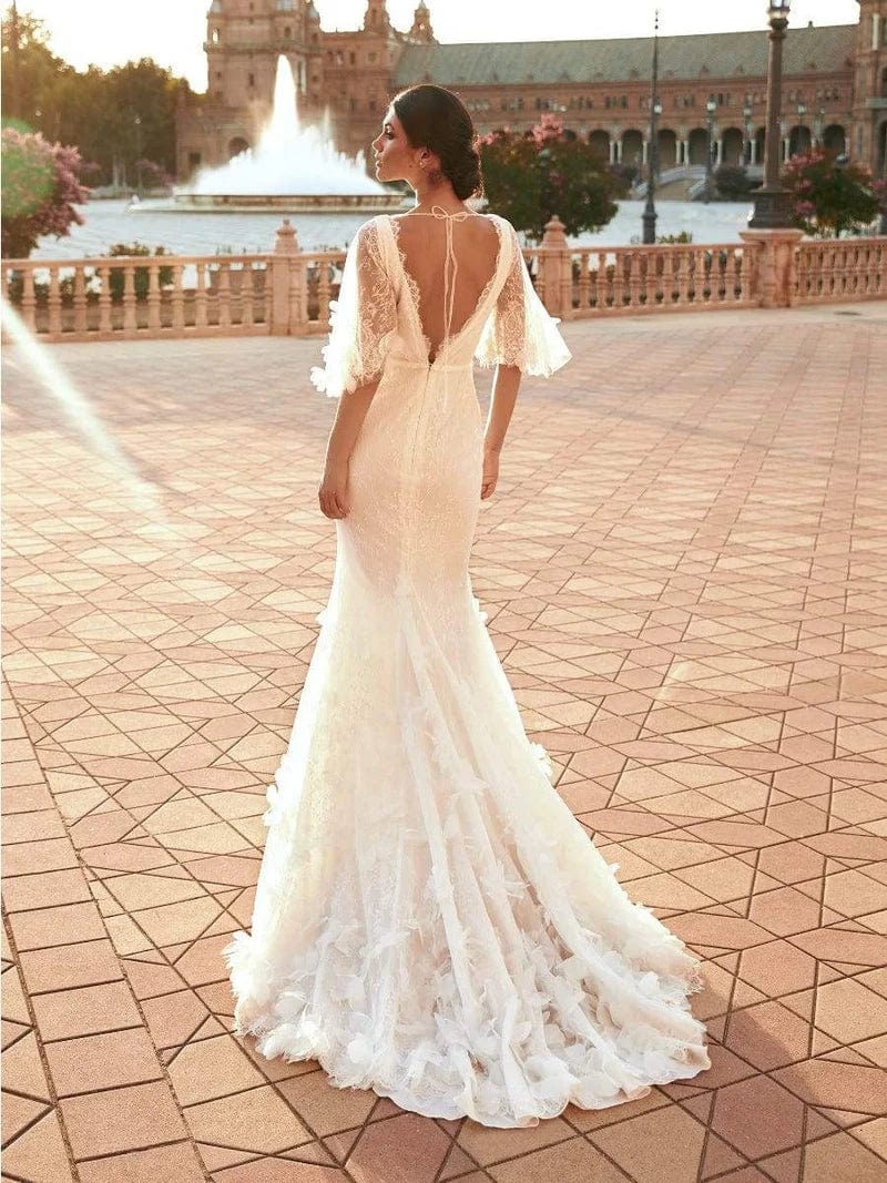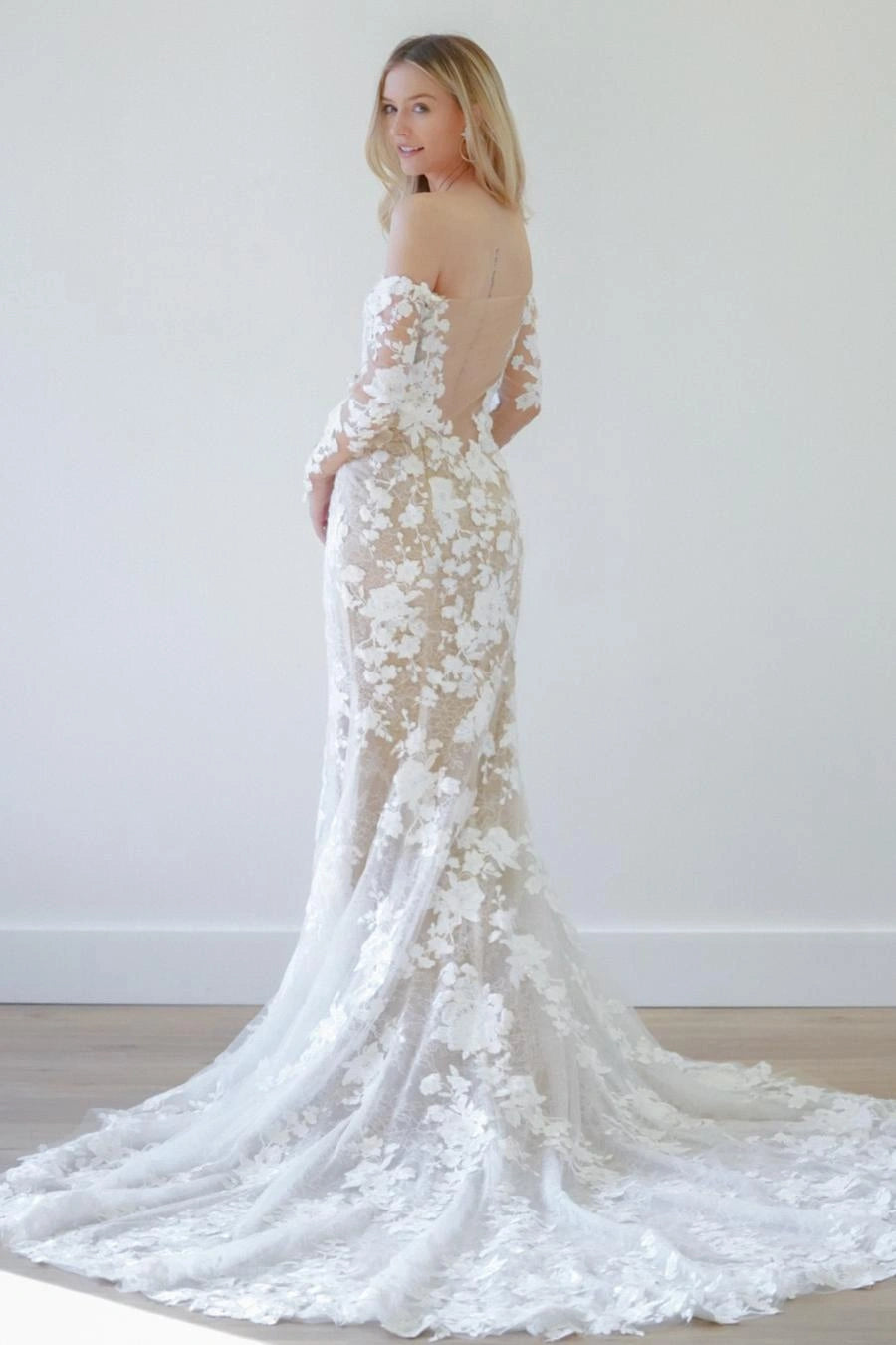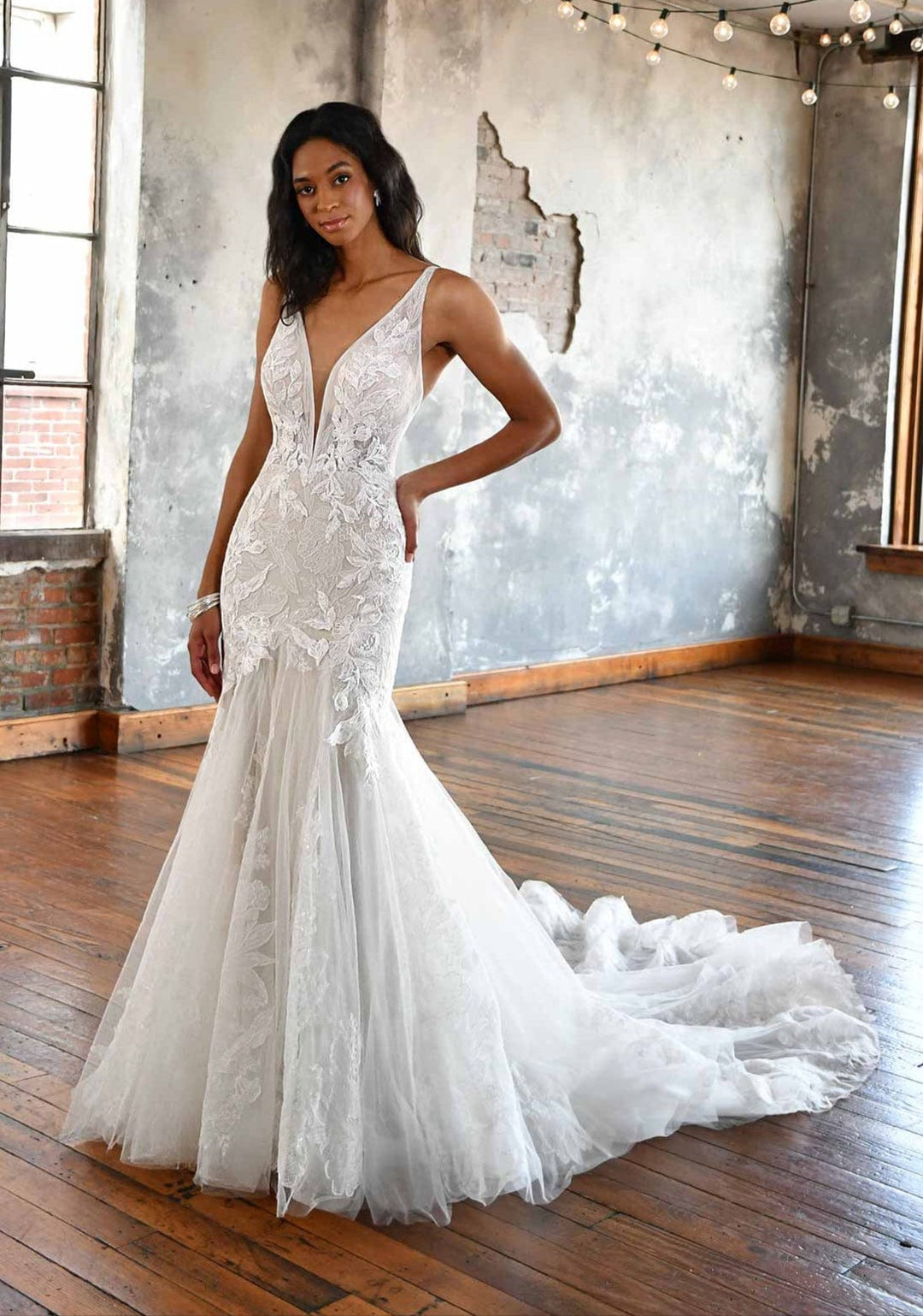 Our wedding gowns are crafted to celebrate your unique beauty. With a variety of necklines, including deep-plunge, V-neck, and off the shoulder styles, you're sure to find a fit and flare wedding dress that complements your personal taste. The fitted bodice hugs your curves before gracefully flaring out at the knee or thigh, creating a romantic and feminine look that's perfect for walking down the aisle.