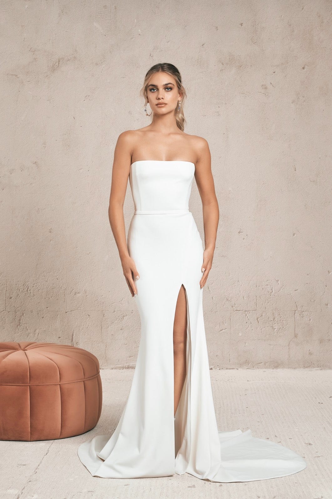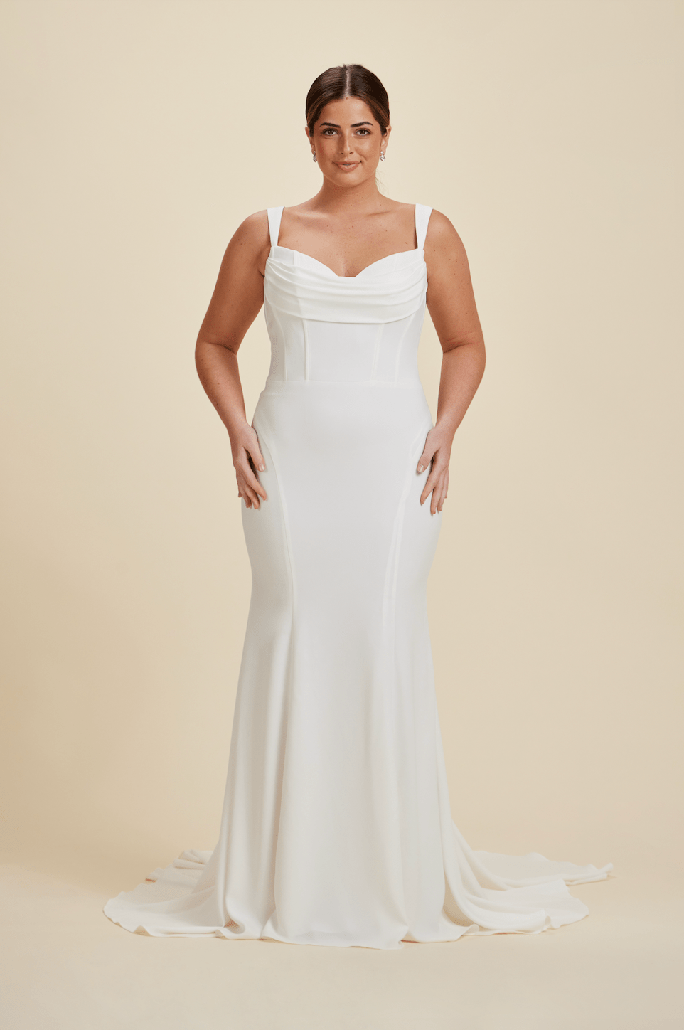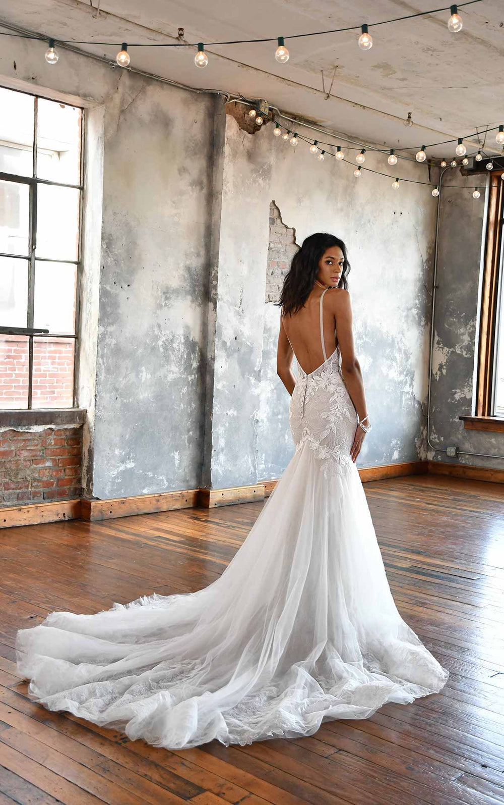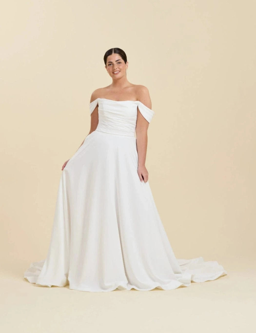 Our wedding gowns are crafted to celebrate your unique beauty. With a variety of necklines, including deep-plunge, V-neck, and off the shoulder styles, you're sure to find a fit and flare wedding dress that complements your personal taste. The fitted bodice hugs your curves before gracefully flaring out at the knee or thigh, creating a romantic and feminine look that's perfect for walking down the aisle.