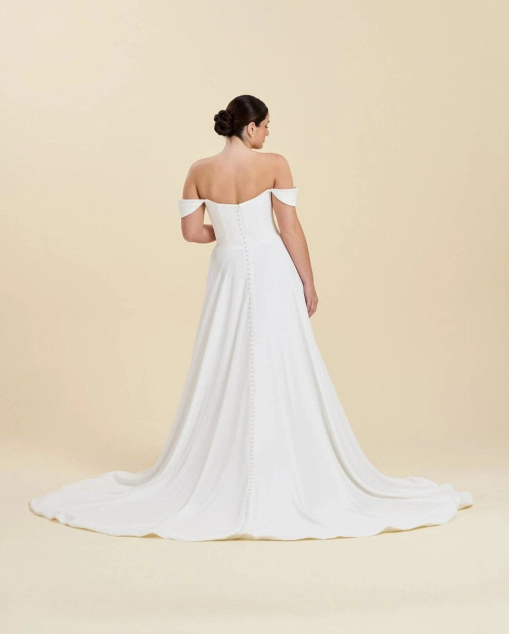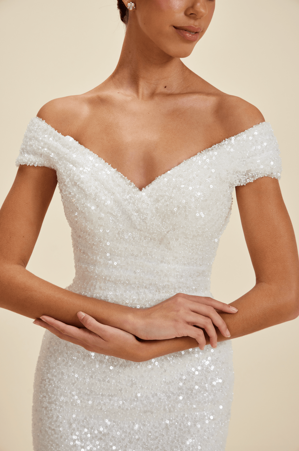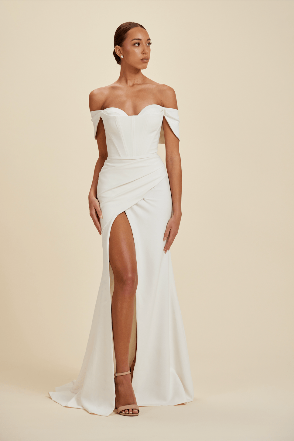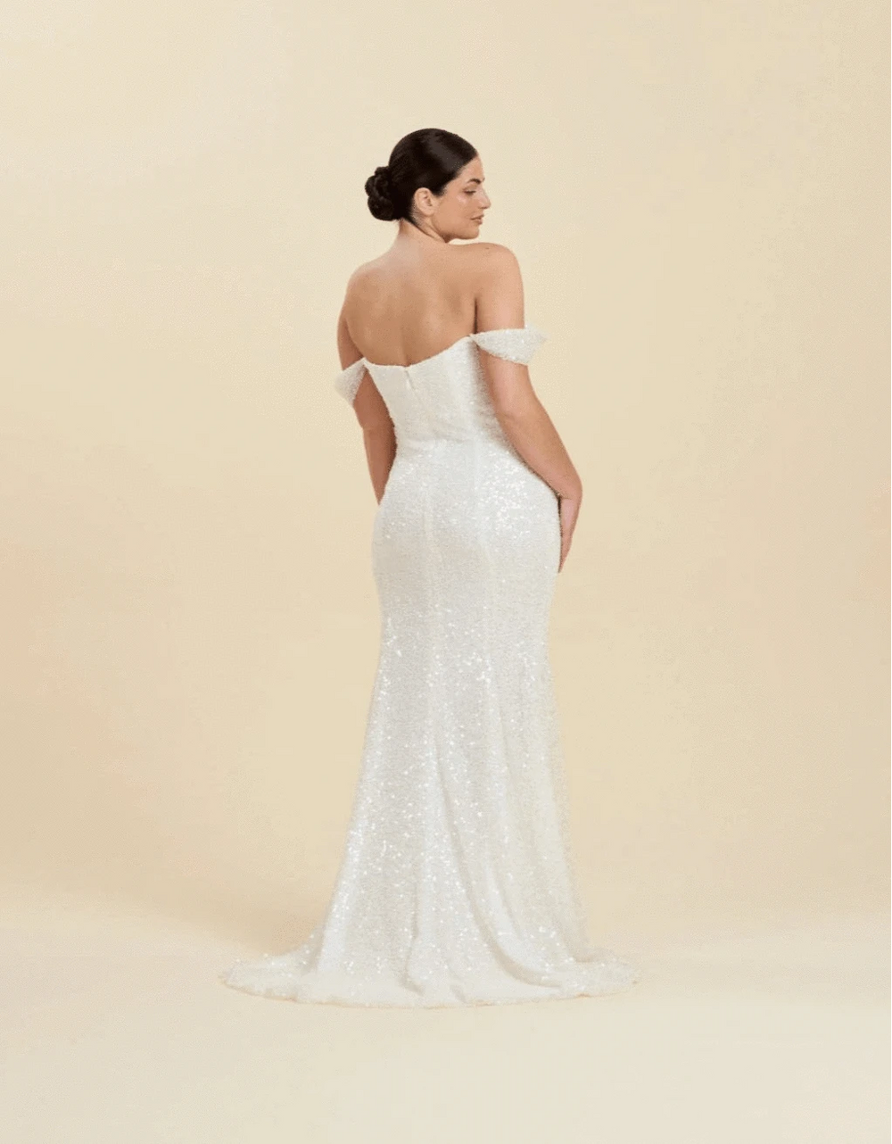 Our wedding gowns are crafted to celebrate your unique beauty. With a variety of necklines, including deep-plunge, V-neck, and off the shoulder styles, you're sure to find a fit and flare wedding dress that complements your personal taste. The fitted bodice hugs your curves before gracefully flaring out at the knee or thigh, creating a romantic and feminine look that's perfect for walking down the aisle.