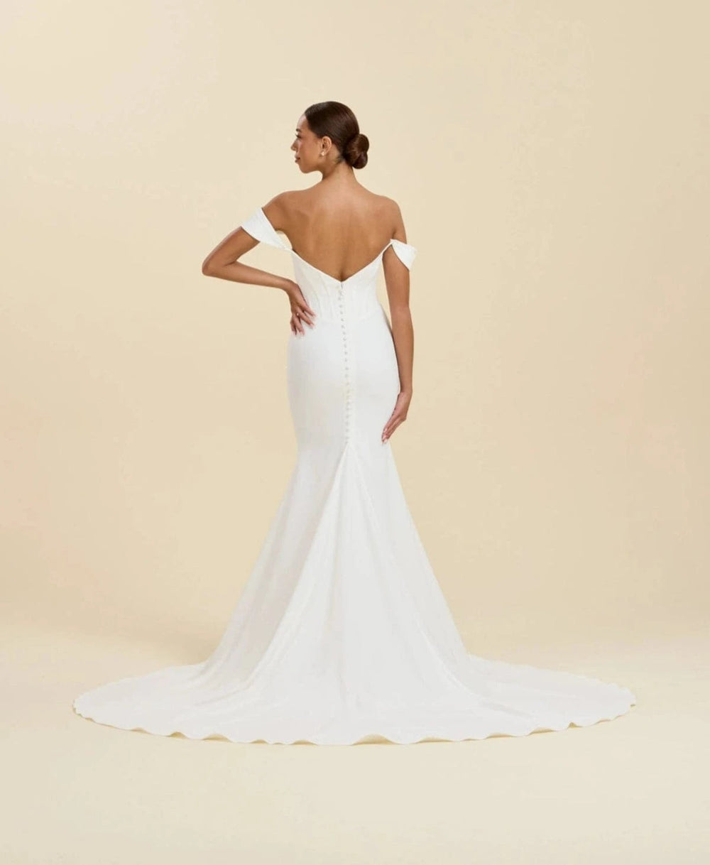 Our wedding gowns are crafted to celebrate your unique beauty. With a variety of necklines, including deep-plunge, V-neck, and off the shoulder styles, you're sure to find a fit and flare wedding dress that complements your personal taste. The fitted bodice hugs your curves before gracefully flaring out at the knee or thigh, creating a romantic and feminine look that's perfect for walking down the aisle.