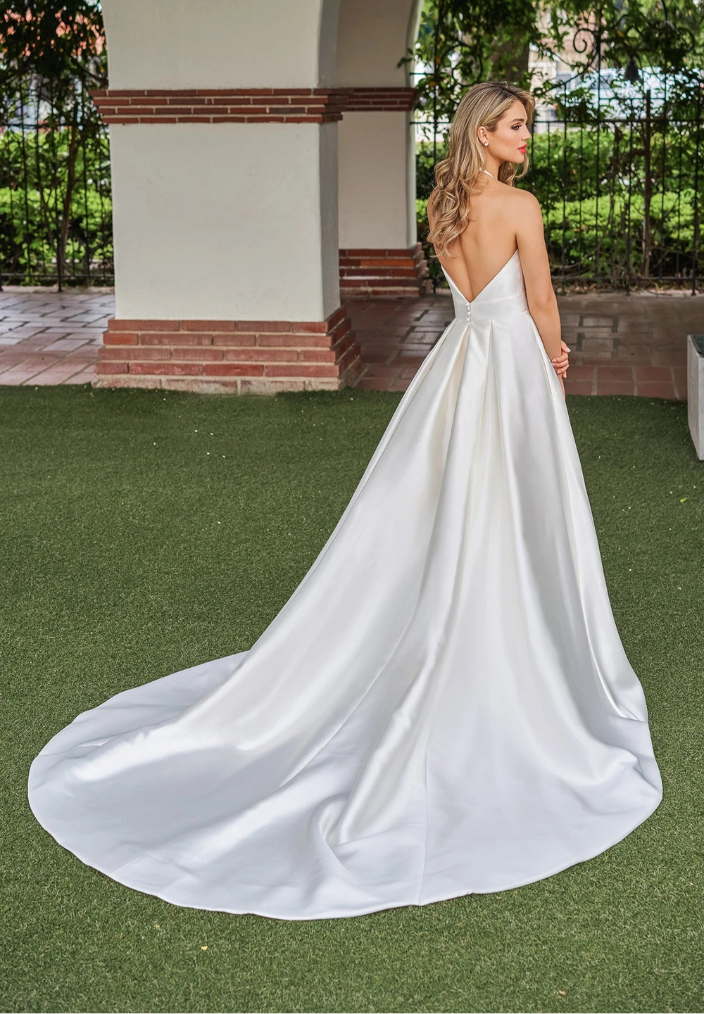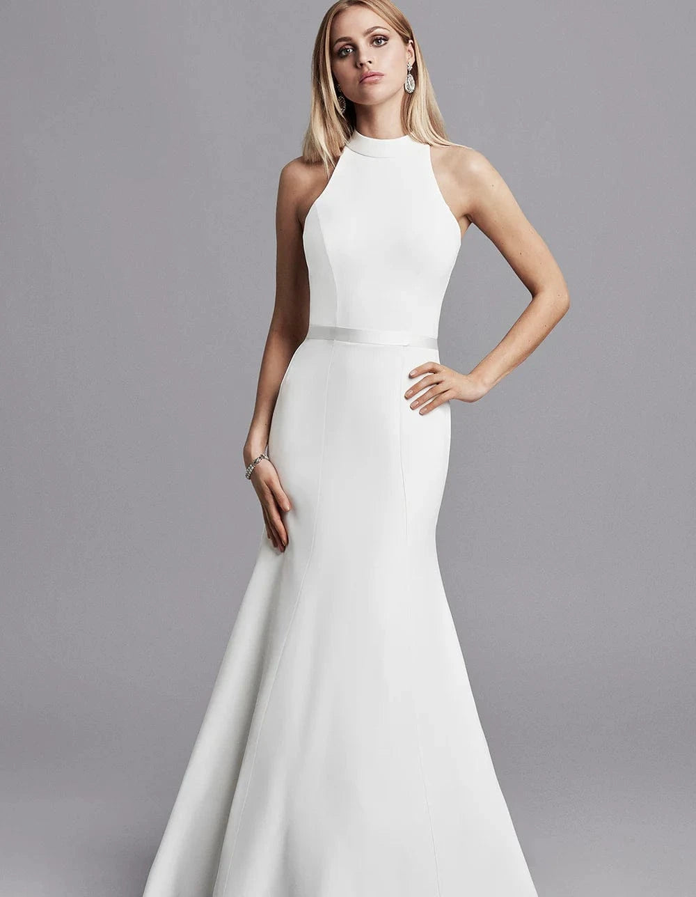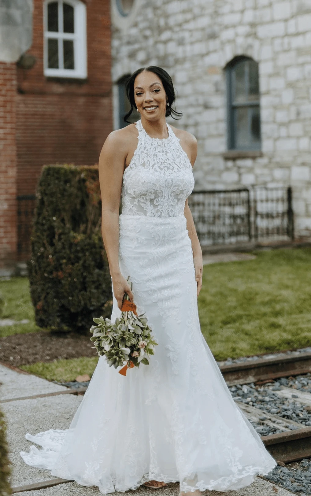 Our halter wedding dress collection consists of discounted sample pieces, meaning that you walk in our boutique, try on, and walk out with your dress. No six-month wait. No formal order process. Find your perfect gown, say YES, and complete your wedding day shopping today. Use our filter to explore by size, price, silhouette, or fabric type.