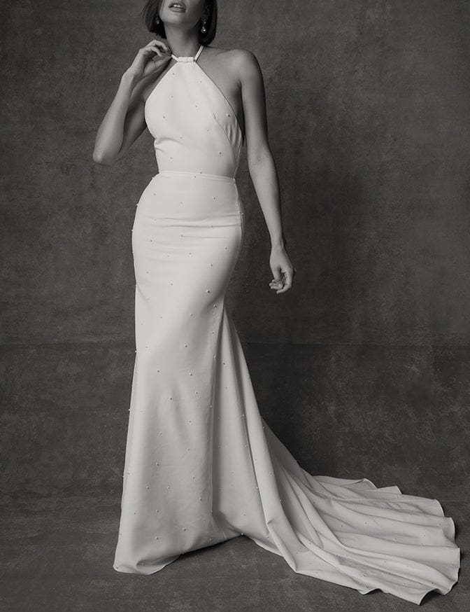 Your halter wedding gown covers the chest beautifully while leaving shoulders bare; enhance this look with curated veils, headpieces, or belts & sashes. Our stylists will guide you through selecting accessories that complete the gown's sophisticated lines, whether you choose a dramatic veil for your aisle moment or a delicate pair of earrings that won't compete with the neckline.