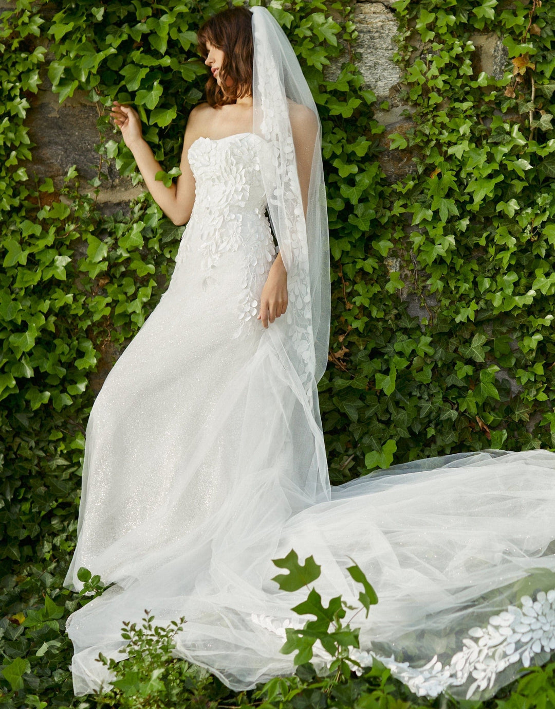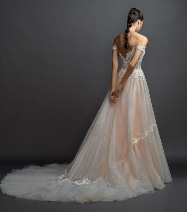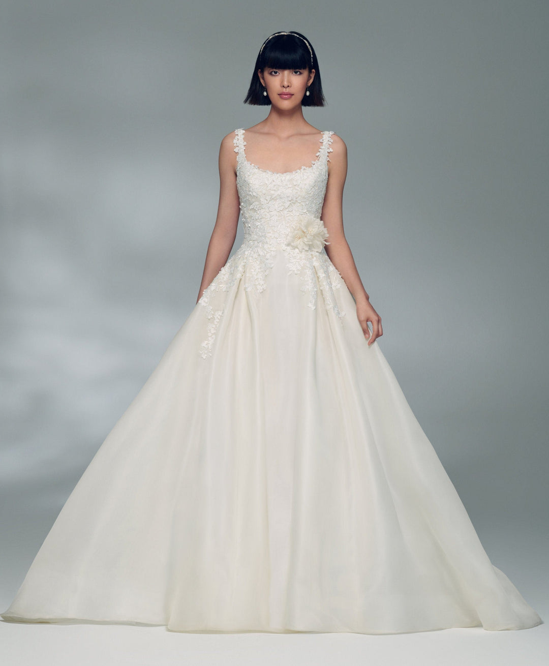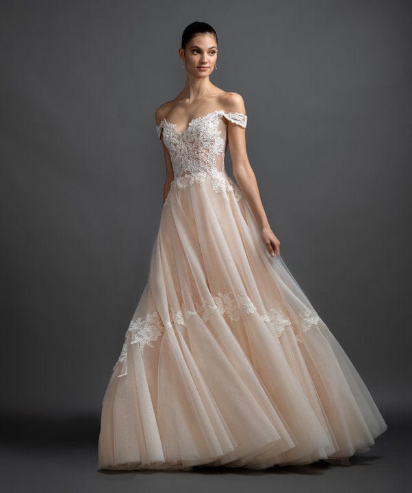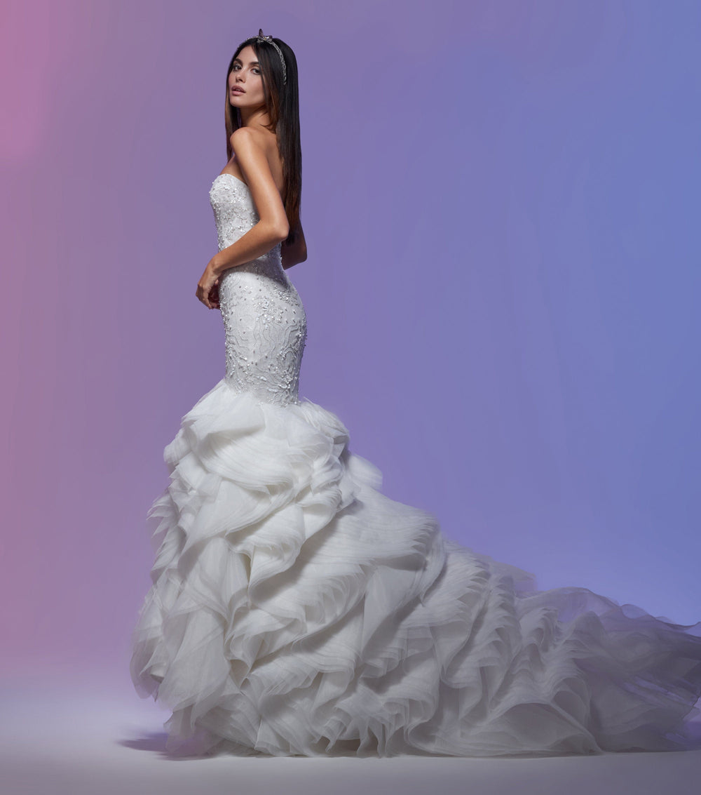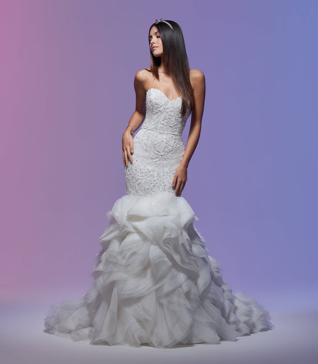 The Lazaro wedding dress collection spans an impressive range of silhouettes. Ball gowns create dramatic, fairytale moments with voluminous skirts and intricate detailing. Mermaid silhouettes offer a more sculpted approach, hugging curves and creating a sleek, sophisticated profile. A-line gowns flow ethereally, crafted from luxurious fabrics that shimmer and move with graceful movement.