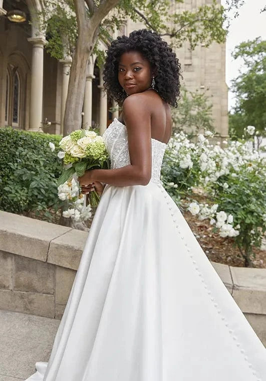 The wedding dress sample sale includes ball gowns with their romantic, voluminous skirts, figure-hugging mermaid styles that create drama, and universally flattering A-line dresses with their soft, flowing structure. For the modern bride, we offer sleek sheath dresses and fit and flare styles that balance fitted elegance with playful movement. Scoop necklines provide a timeless, feminine look, while sweetheart and off the shoulder styles highlight your décolletage beautifully.