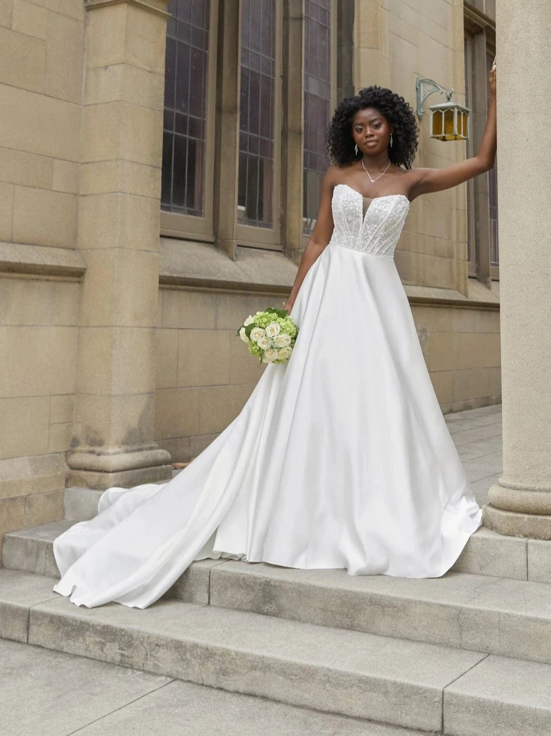 Our wedding dress sample sale features stunning gowns from top designers that have been tried on as samples in high end bridal boutiques. These bridal dress sample sale finds offer significant savings, while still providing the quality and style you deserve for your wedding day. Sample sale wedding dresses are perfect for brides with shorter timelines or those looking to maximize their budget without compromising on design. Sustainability is another benefit. When you say yes to a sample bridal gown, you're purchasing a gown that has already been made, instead of putting a completely new garment into production.