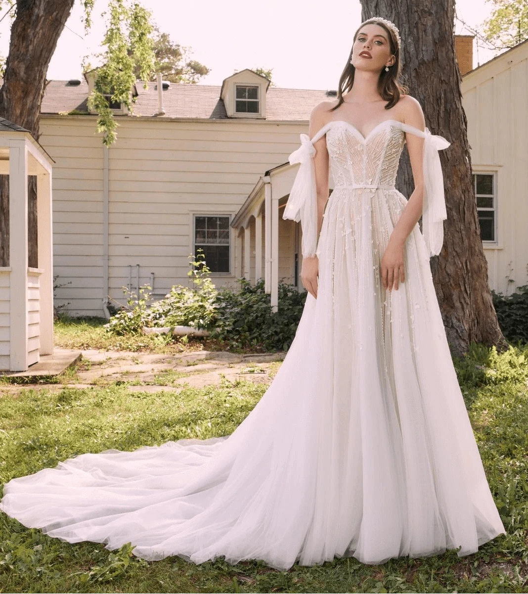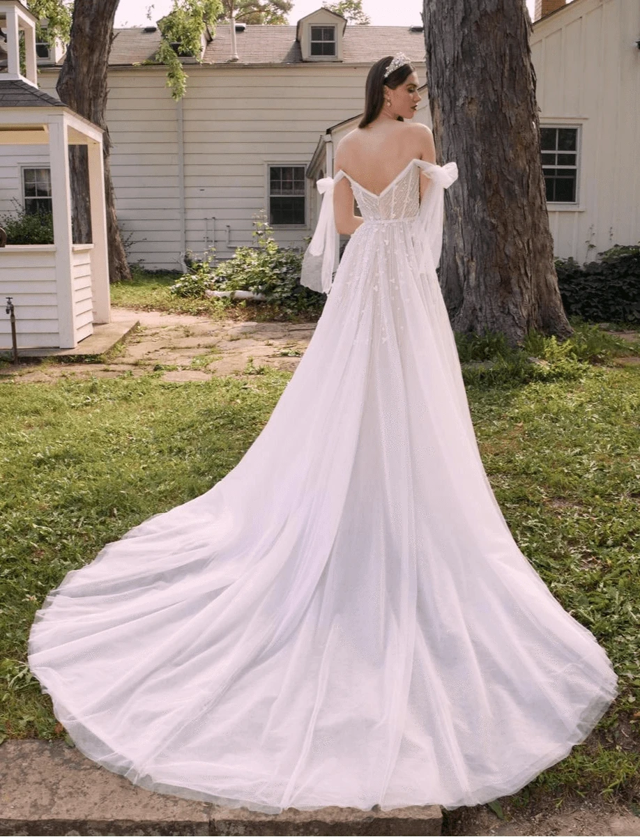 The wedding dress sample sale includes ball gowns with their romantic, voluminous skirts, figure-hugging mermaid styles that create drama, and universally flattering A-line dresses with their soft, flowing structure. For the modern bride, we offer sleek sheath dresses and fit and flare styles that balance fitted elegance with playful movement. Scoop necklines provide a timeless, feminine look, while sweetheart and off the shoulder styles highlight your décolletage beautifully.