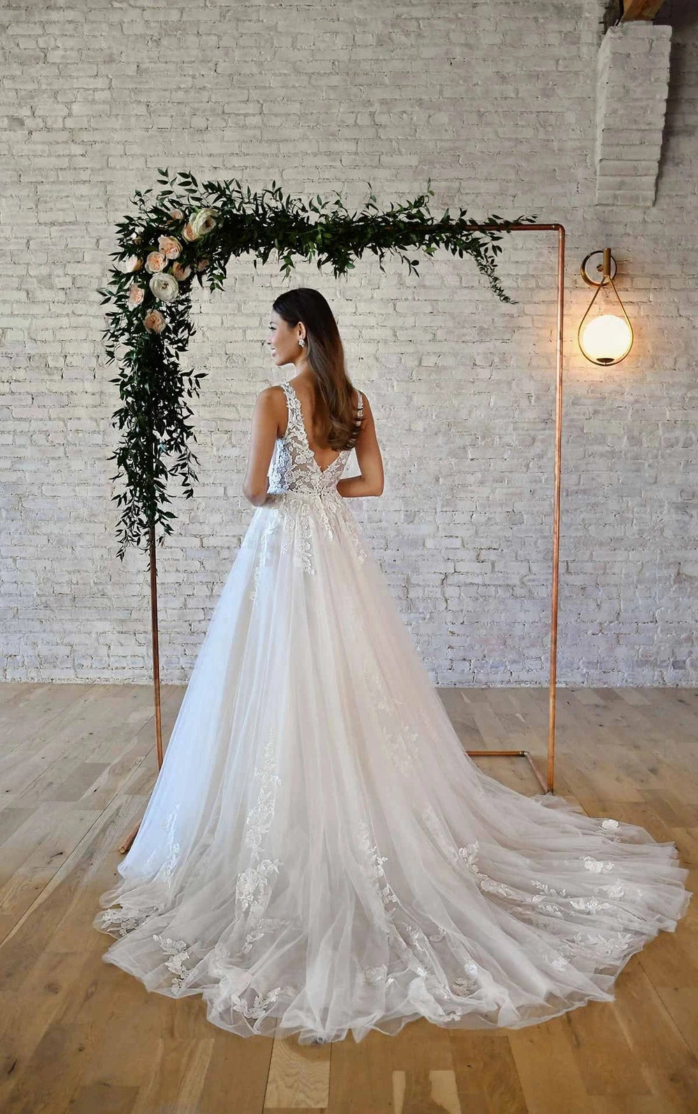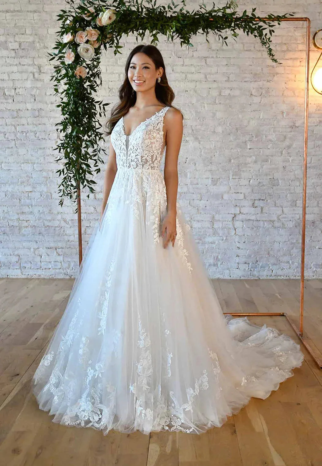 A V-neck wedding dress pairs beautifully with all types of accessories. We suggest you skip the necklace and choose statement earrings instead. Add a cathedral veil for drama or a crystal belt for waist definition. Our personal bridal stylist can guide you through accessories like veils, headpieces, or belts & sashes that complete your wedding day style.