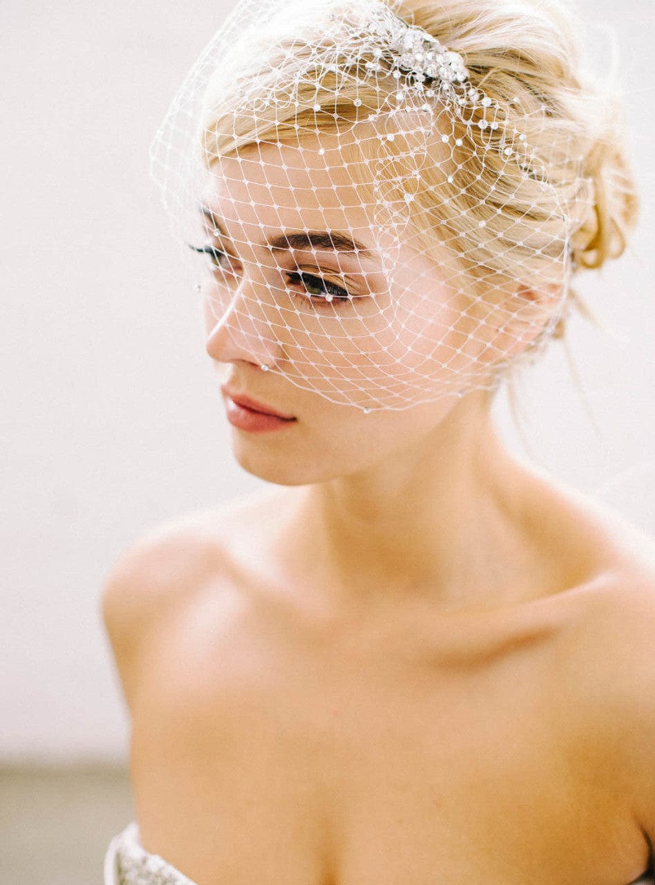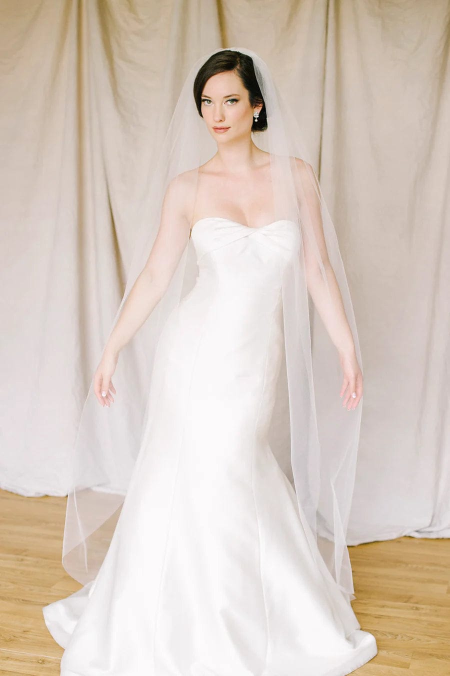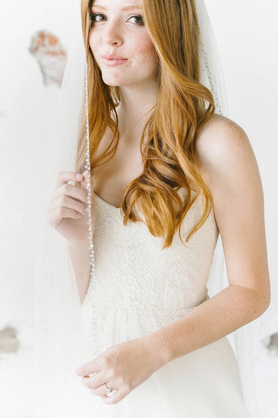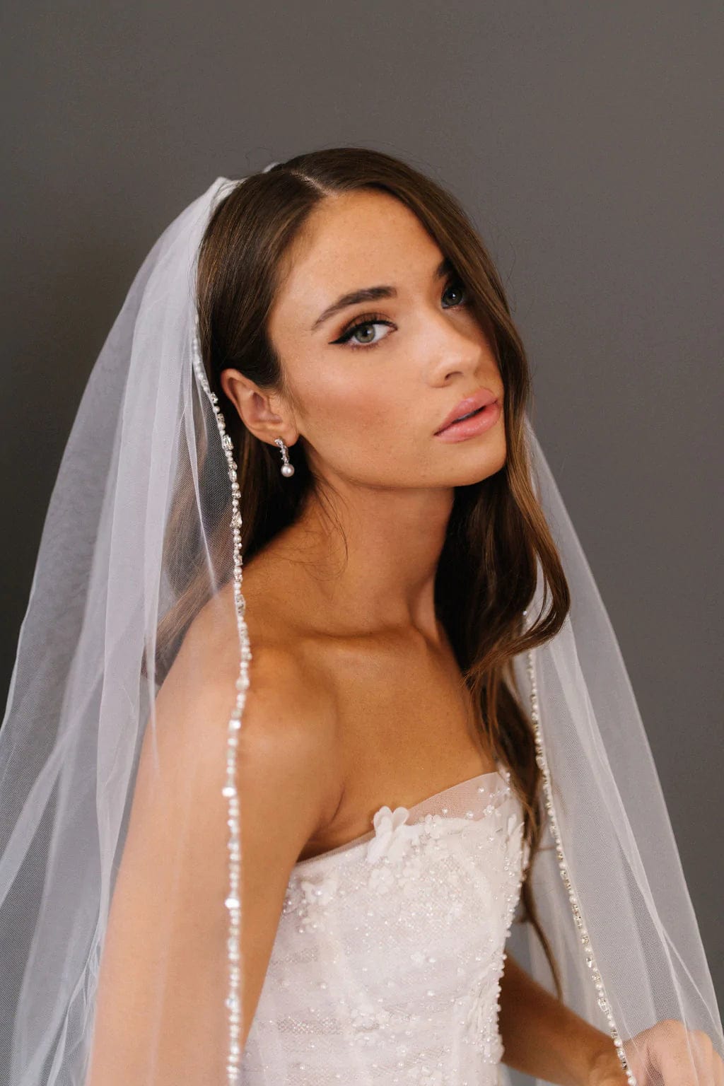 When styling your wedding veil with your gown, consider how your other accessories will work together. A pair of small, delicate earrings beautifully complements a simple fingertip veil, while more intricate crystal earrings can enhance cathedral veils for a refined, elegant effect. For high necklines, skip the necklace and let your veil be the star, or choose elegant drop earrings instead.