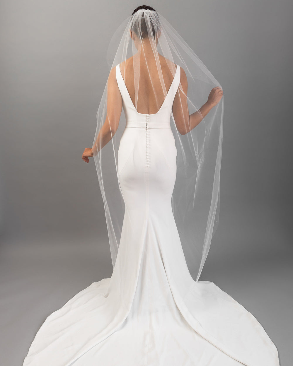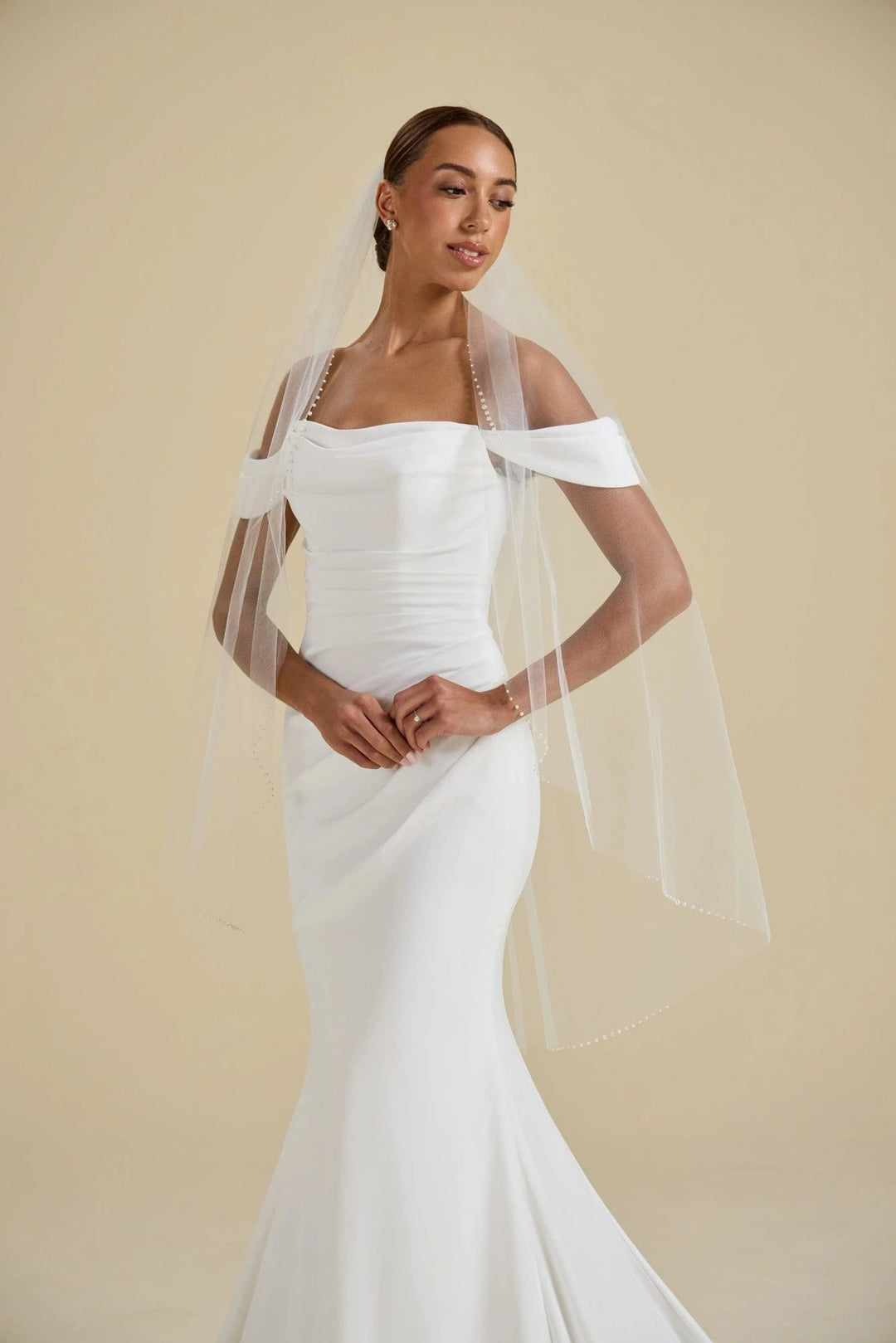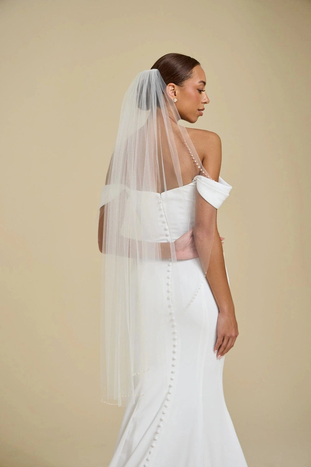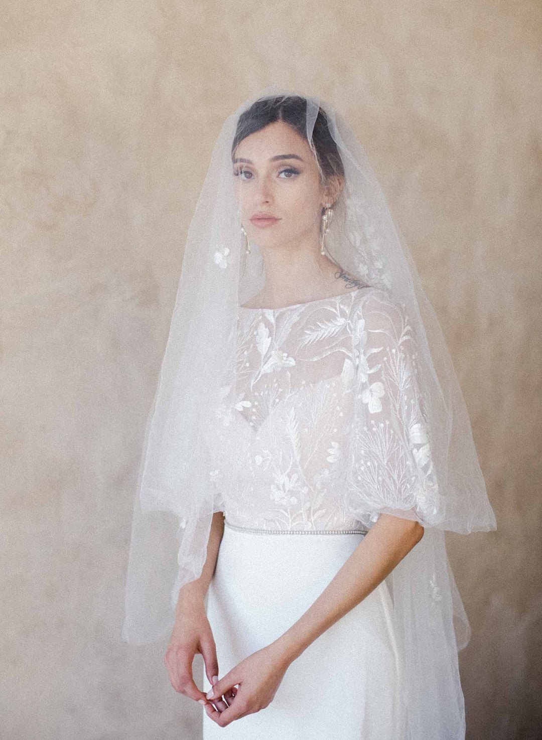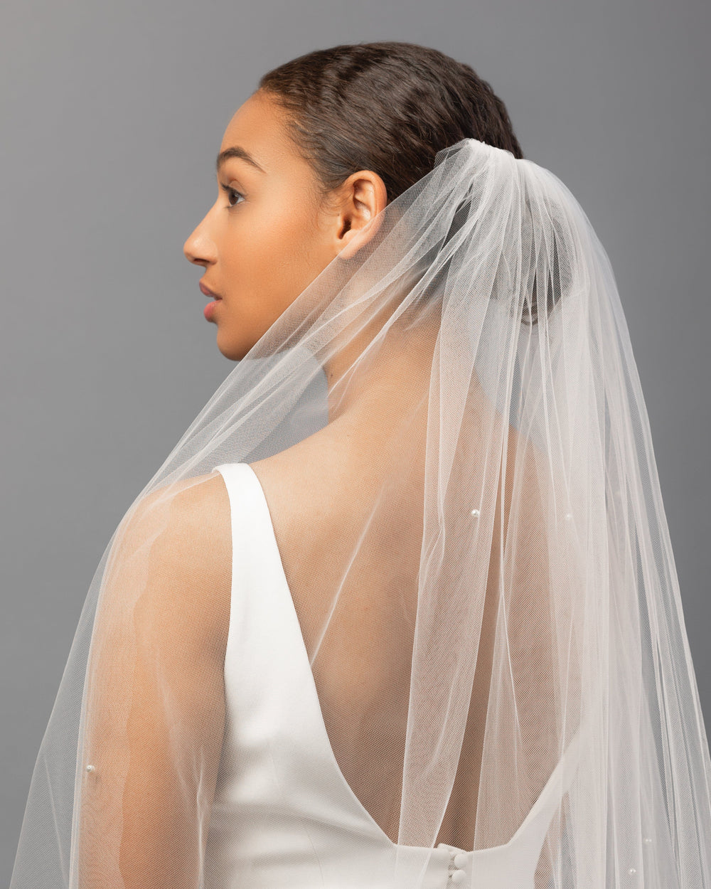 When styling your wedding veil with your gown, consider how your other accessories will work together. A pair of small, delicate earrings beautifully complements a simple fingertip veil, while more intricate crystal earrings can enhance cathedral veils for a refined, elegant effect. For high necklines, skip the necklace and let your veil be the star, or choose elegant drop earrings instead.