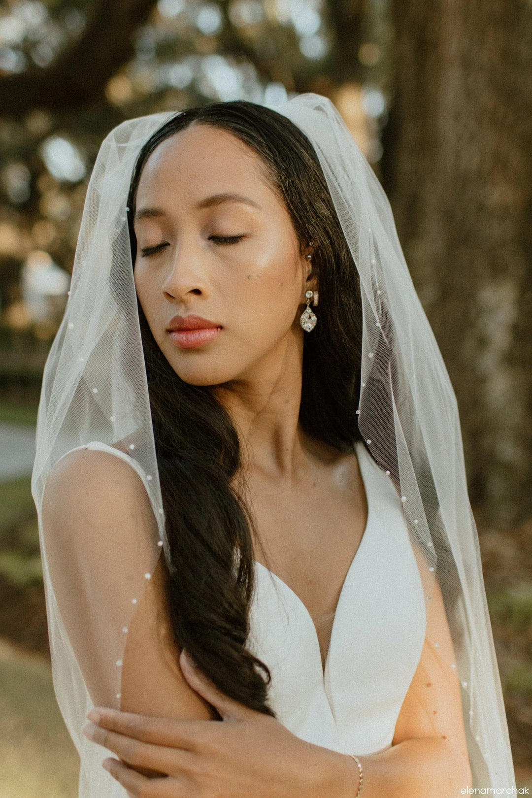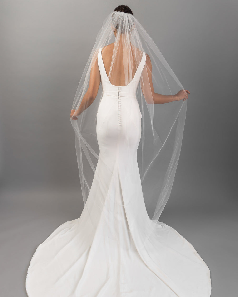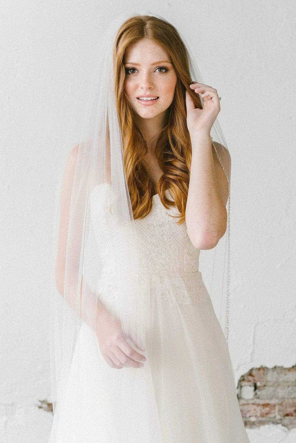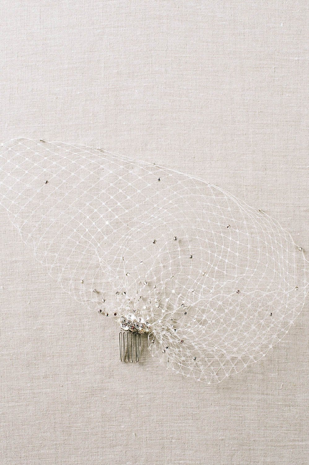 When styling your wedding veil with your gown, consider how your other accessories will work together. A pair of small, delicate earrings beautifully complements a simple fingertip veil, while more intricate crystal earrings can enhance cathedral veils for a refined, elegant effect. For high necklines, skip the necklace and let your veil be the star, or choose elegant drop earrings instead.