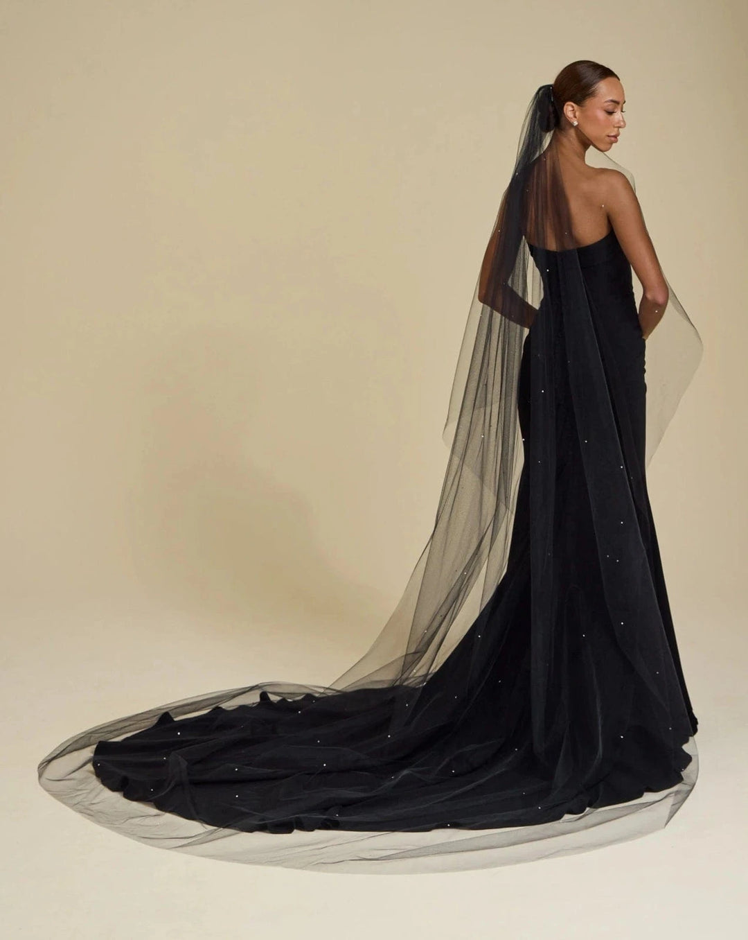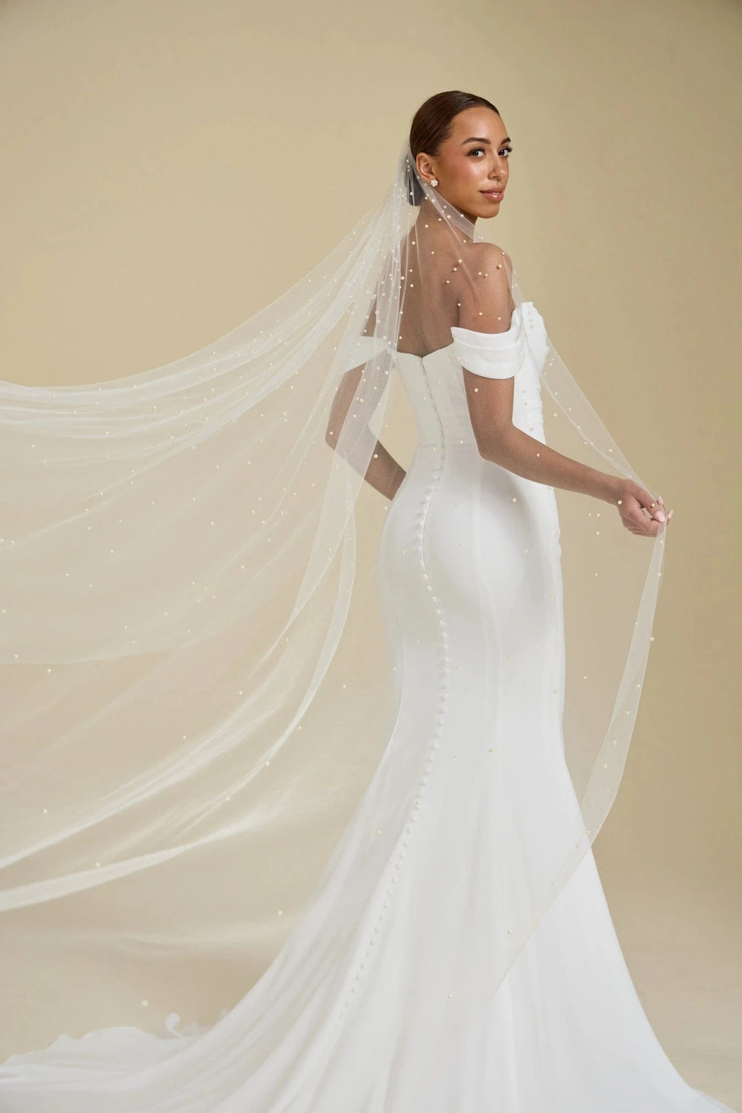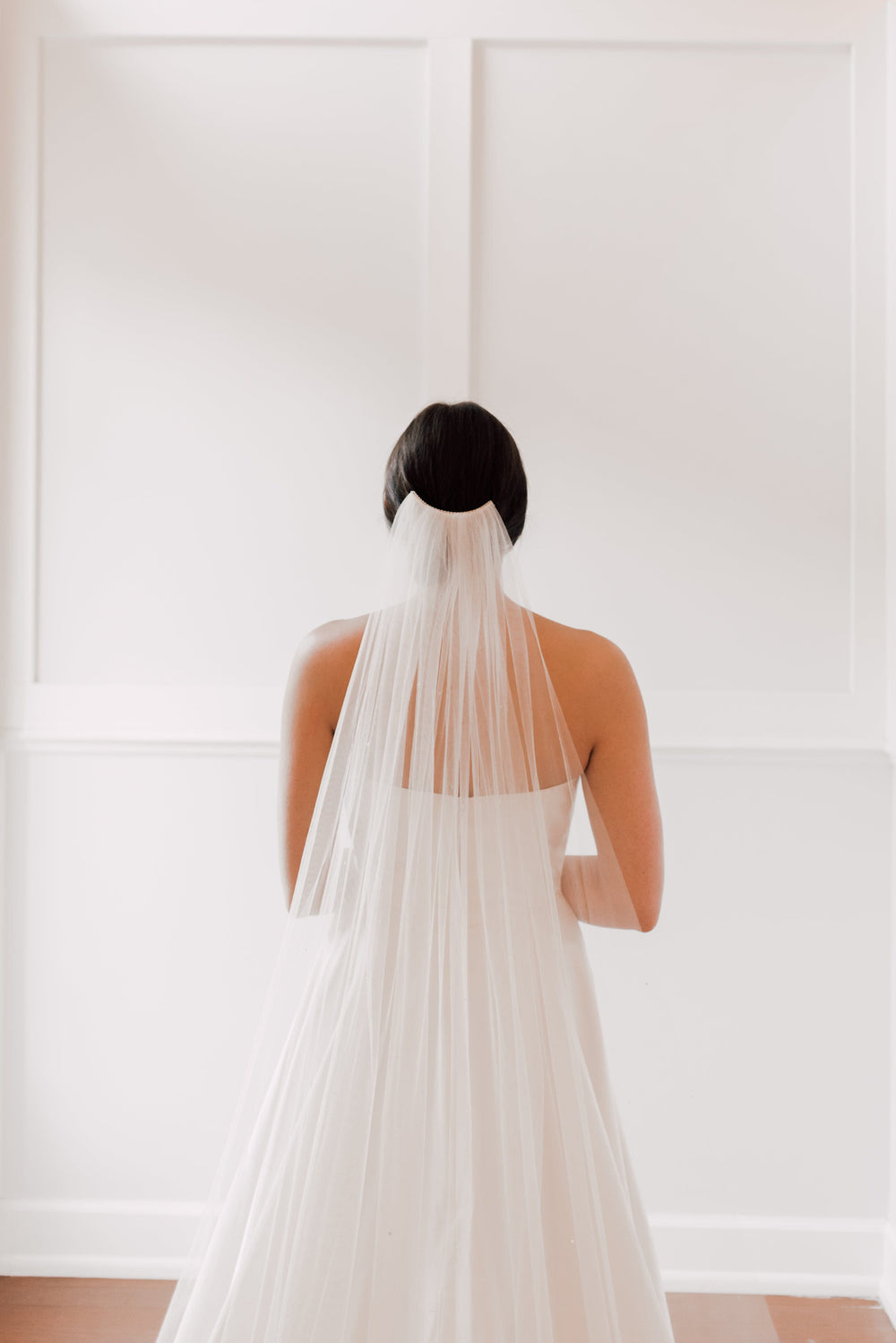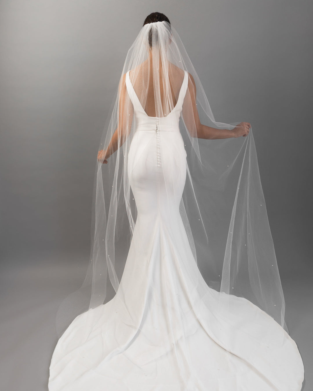 When styling your wedding veil with your gown, consider how your other accessories will work together. A pair of small, delicate earrings beautifully complements a simple fingertip veil, while more intricate crystal earrings can enhance cathedral veils for a refined, elegant effect. For high necklines, skip the necklace and let your veil be the star, or choose elegant drop earrings instead.