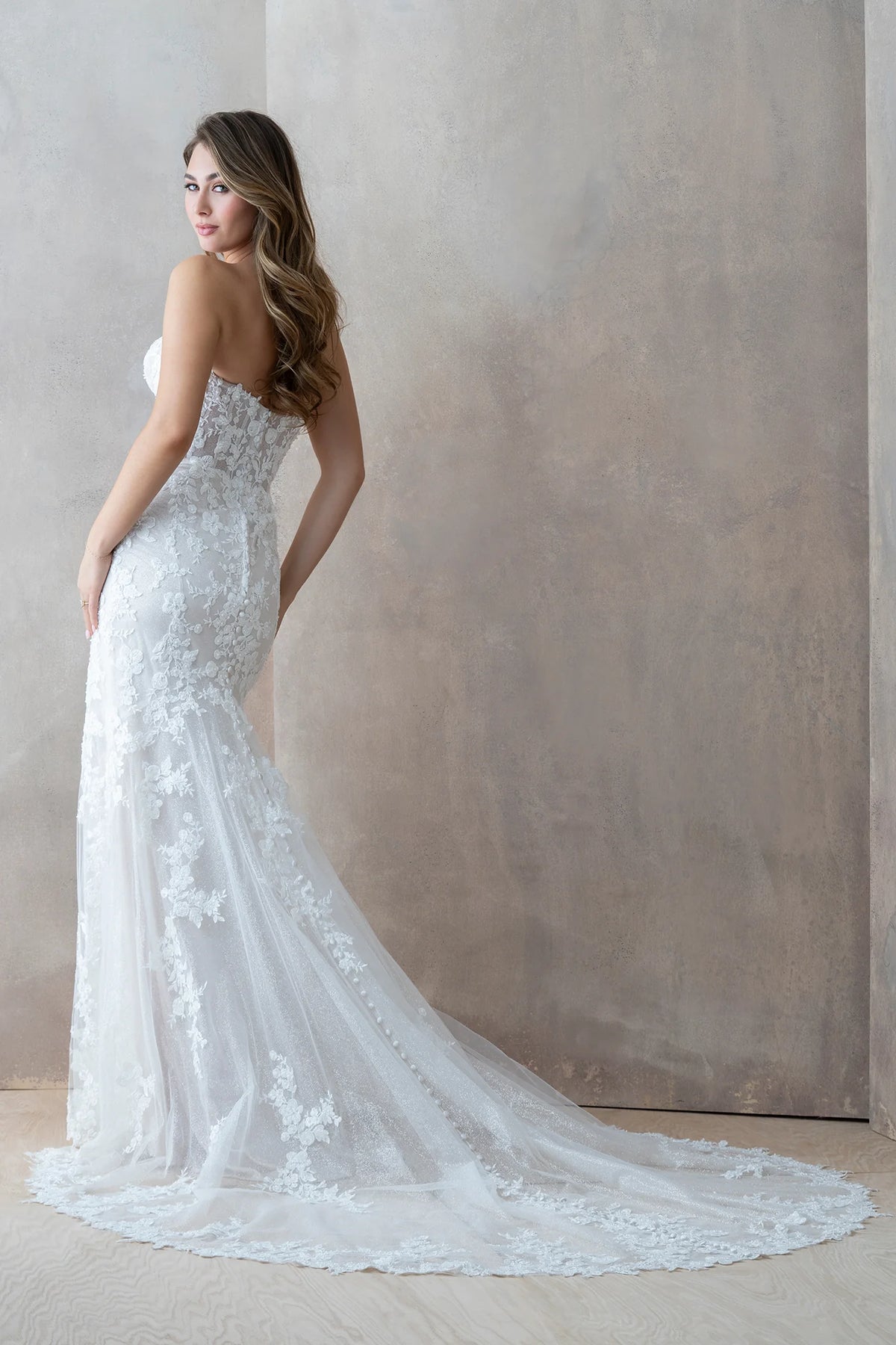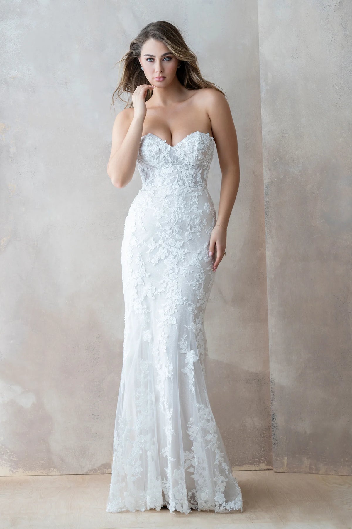 Abella Bruna is a sparkly beaded lace sheath wedding dress with a sweetheart neckline! Please note, our gown is the lined version. This gown comes to us in great condition from a designer boutique. Abella Bruna is Ivory in color and a size 14.