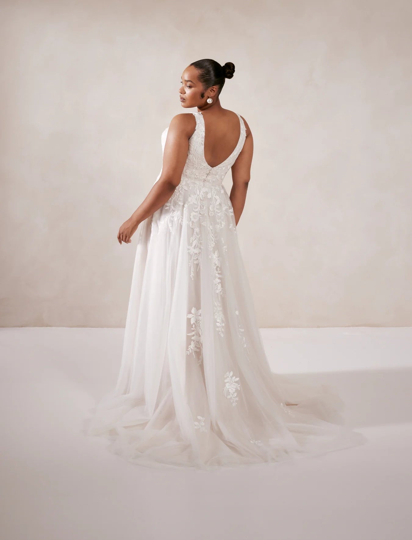 Adore by Justin Alexander 11299 is a beautiful tulle A-line wedding dress featuring lace appliqués + a V neckline! This gown comes to us in great condition from a designer boutique. Adore by Justin Alexander 11299 is Sand/Ivory/Latte in color and a size 26.