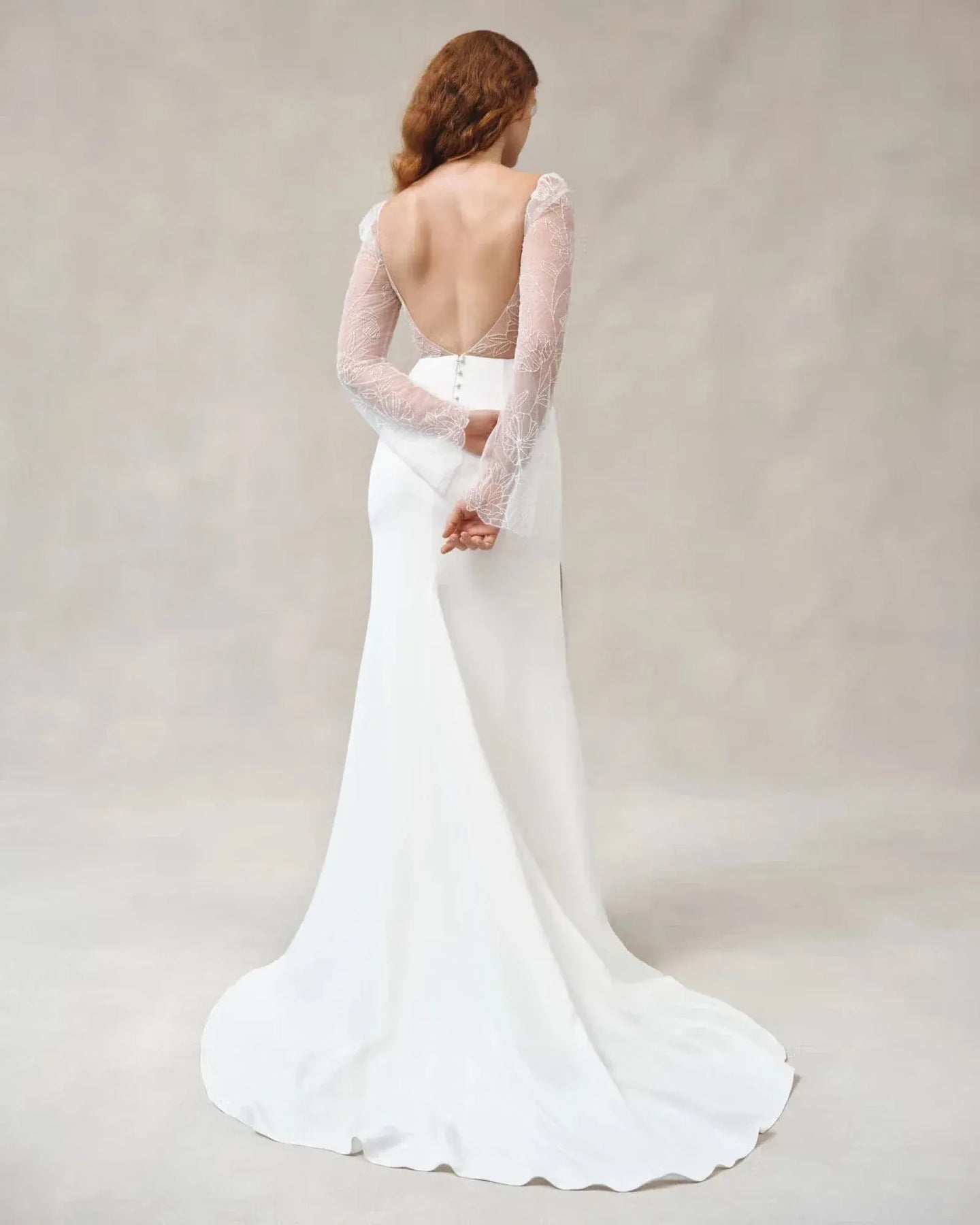 Alexandra Grecco Beatrice is a lovely crepe sheath wedding dress featuring sheer embroidered long sleeves! This gown comes to us in great condition from a designer boutique. Alexandra Grecco Beatrice is Off White in color and a size 8.