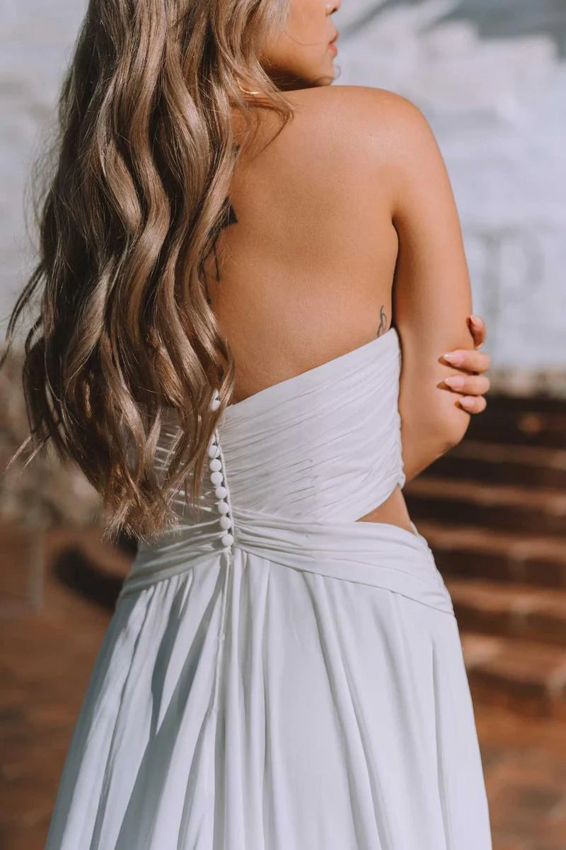 Our gowns haven't been worn down the aisle, but they may have been tried on by brides who chose a different dress. We hold our samples to high standards, though some may need a little extra love, like a loose button or a broken zipper - small fixes that a skilled seamstress can easily handle. Those minor imperfections mean major discounts! While we do our best to keep gowns in pristine condition, wear and tear can occur during try on. If you're interested in this style, please do not hesitate to text or email us for more details or additional photos before saying YES!