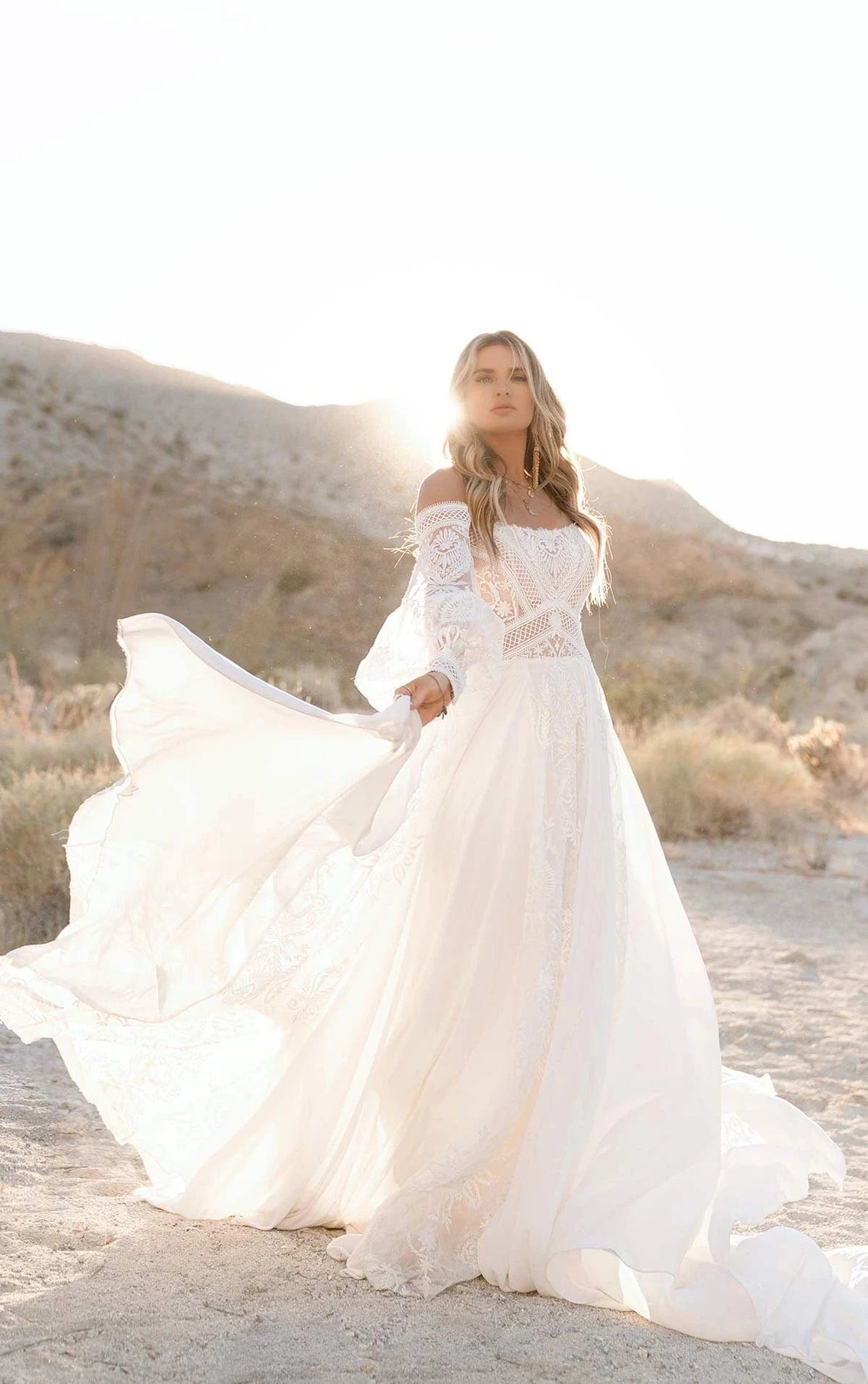 All Who Wander Maddox is a bohemian chiffon A-line wedding dress featuring lace details + detachable long sleeves! This gown comes to us in great condition from a designer boutique. All Who Wander Maddox is Ivory/Ivory/Porcelain in color and a size 16.