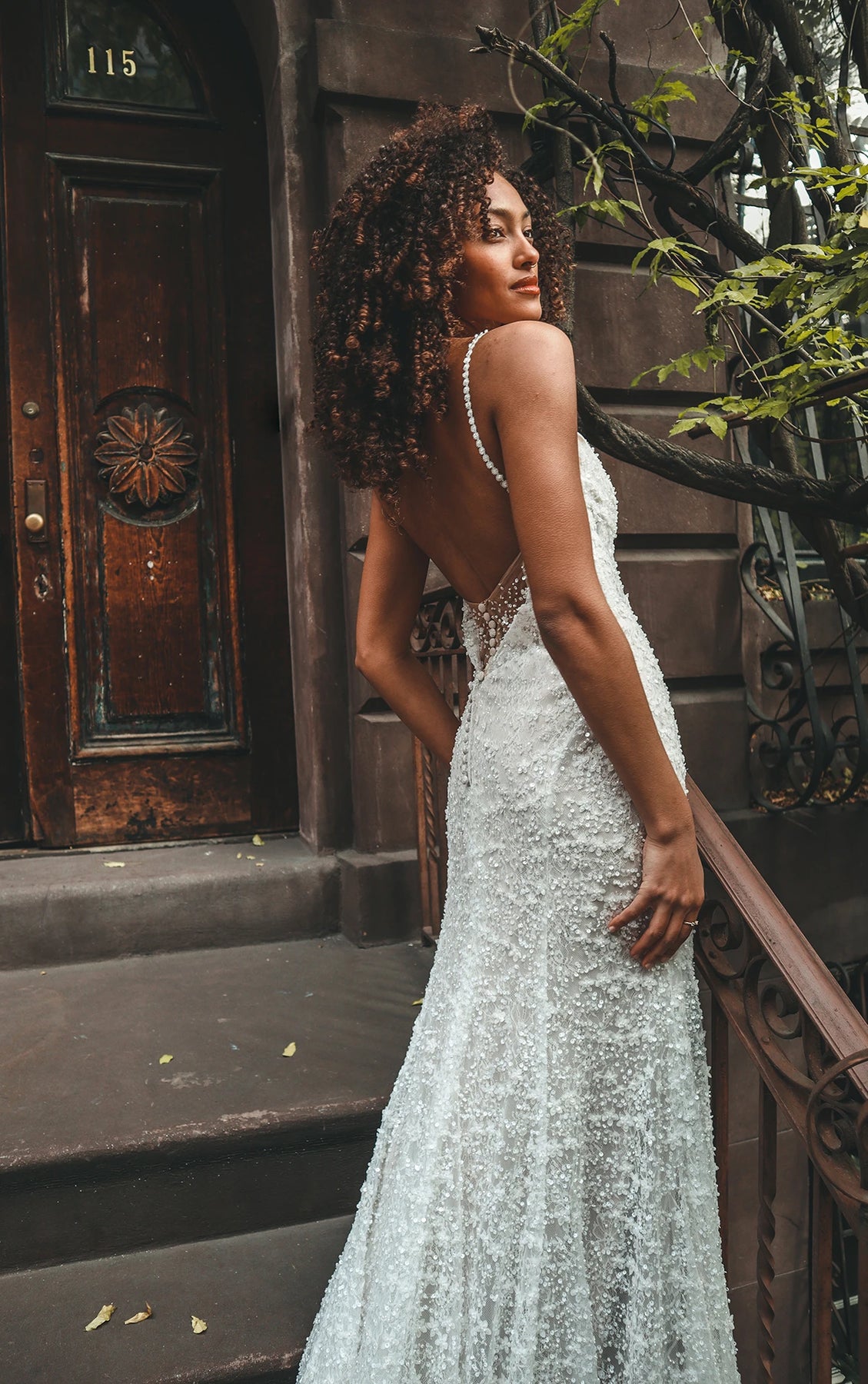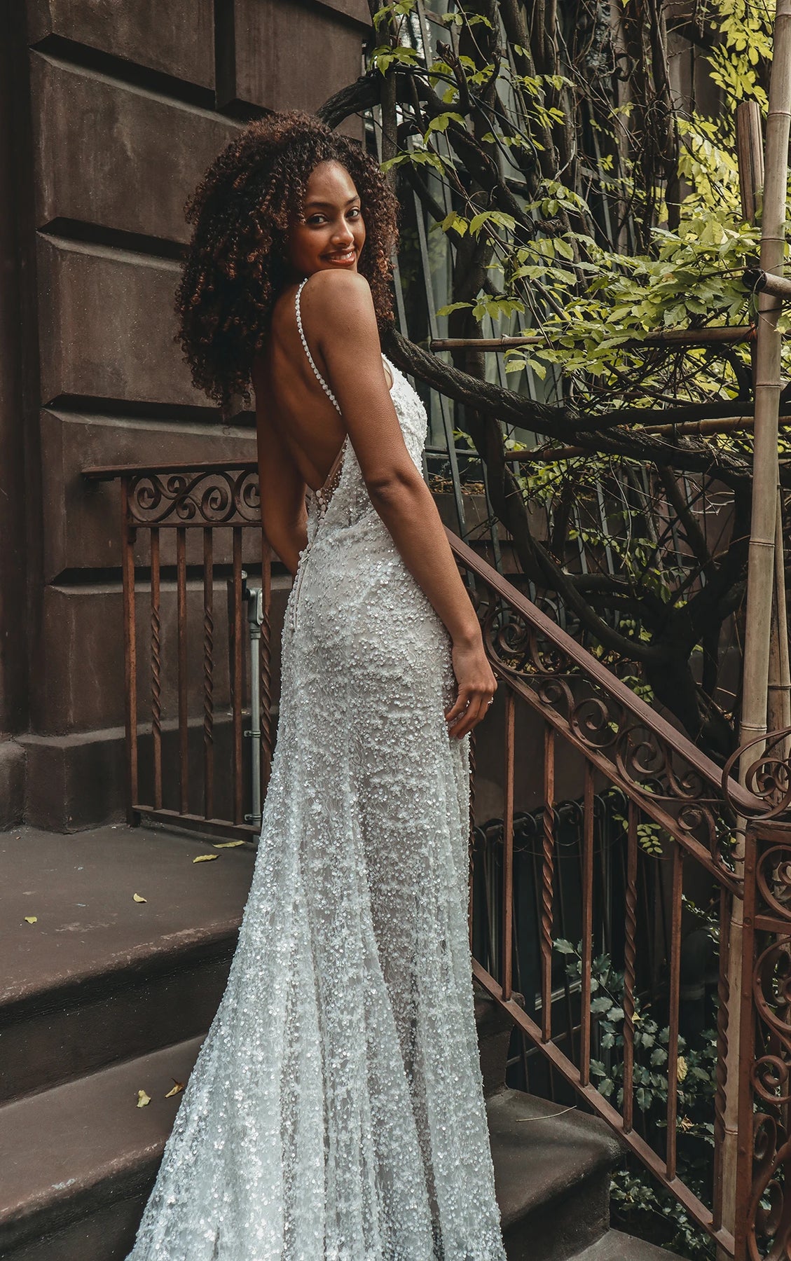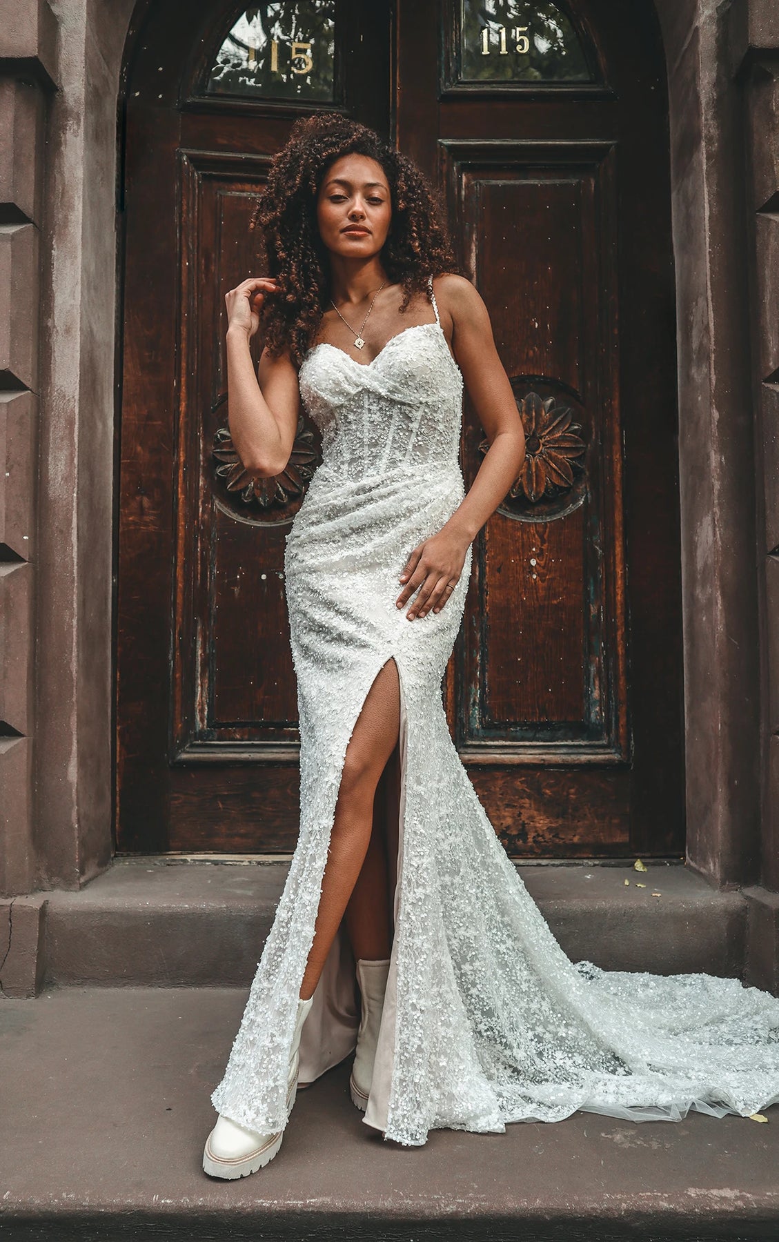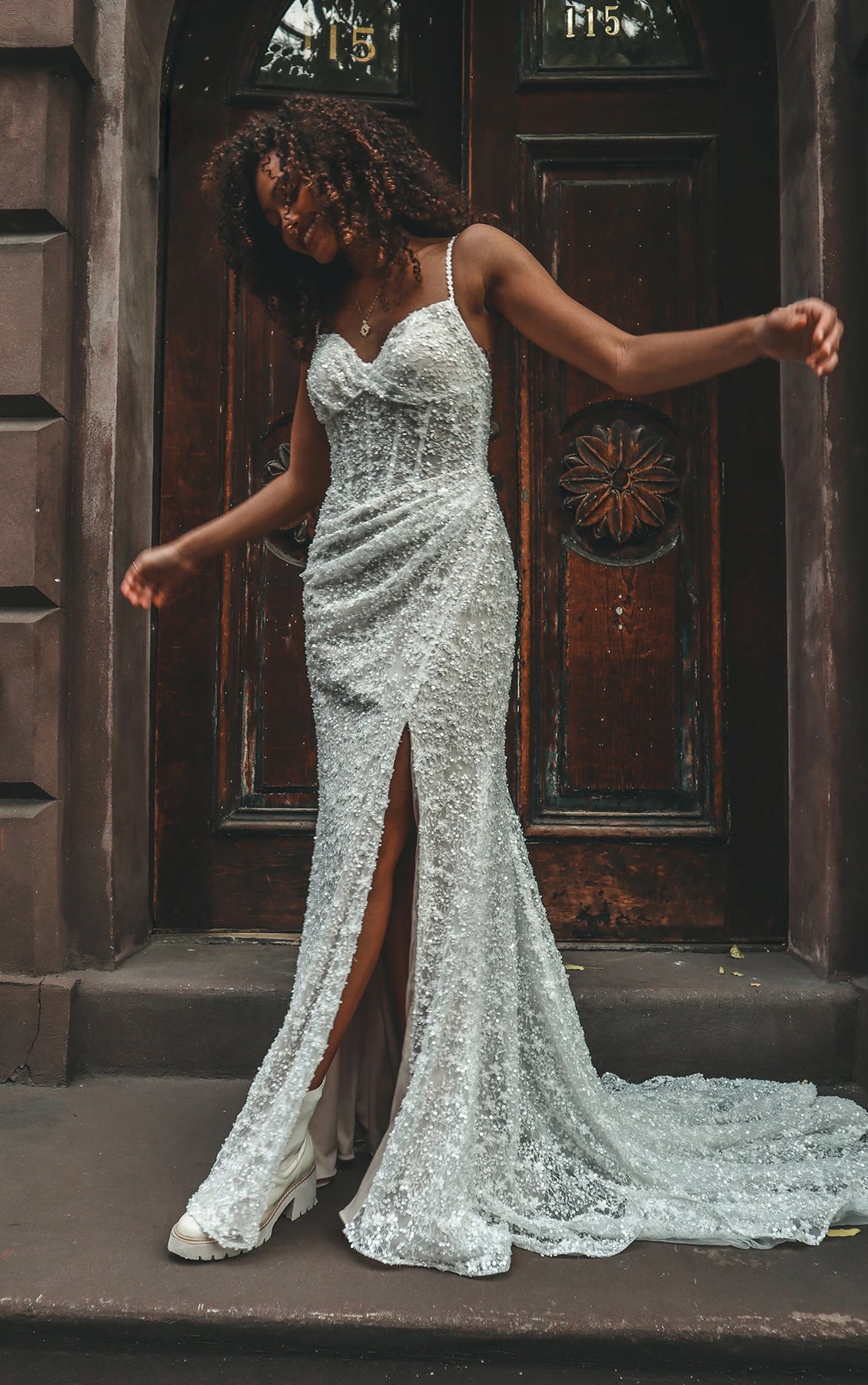 All Who Wander Parker is a fully beaded sheath wedding dress featuring thin beaded straps + a slit in the skirt! This gown comes to us in good condition from a designer boutique. There is a small spot n the underskirt. All Who Wander Parker is Ivory/Rum/Porcelain in color and a size 8.