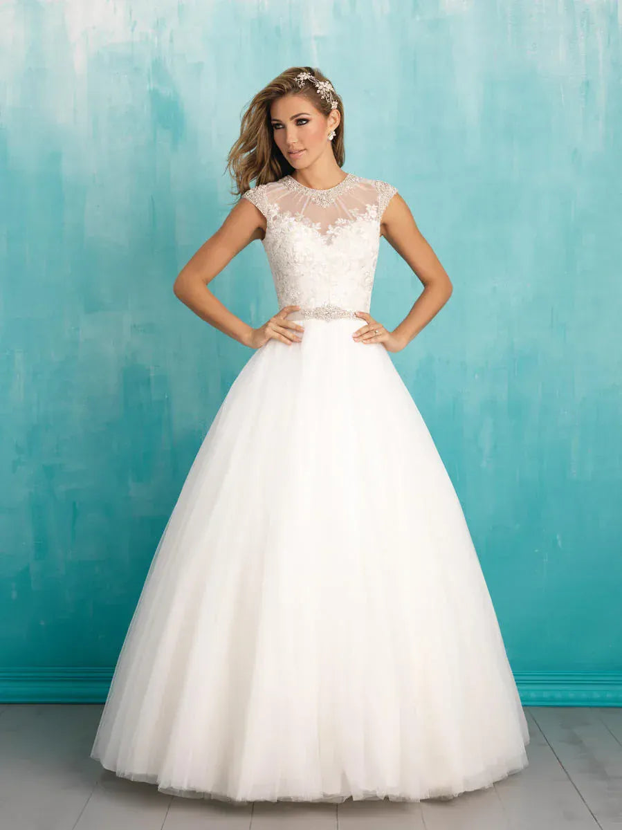 Allure 9301 is a beautiful tulle ball gown featuring an illusion neckline! This gown comes to us in good condition from a designer boutique. There are spots on the lining. Allure 9301 is Ivory in color and a size 4.