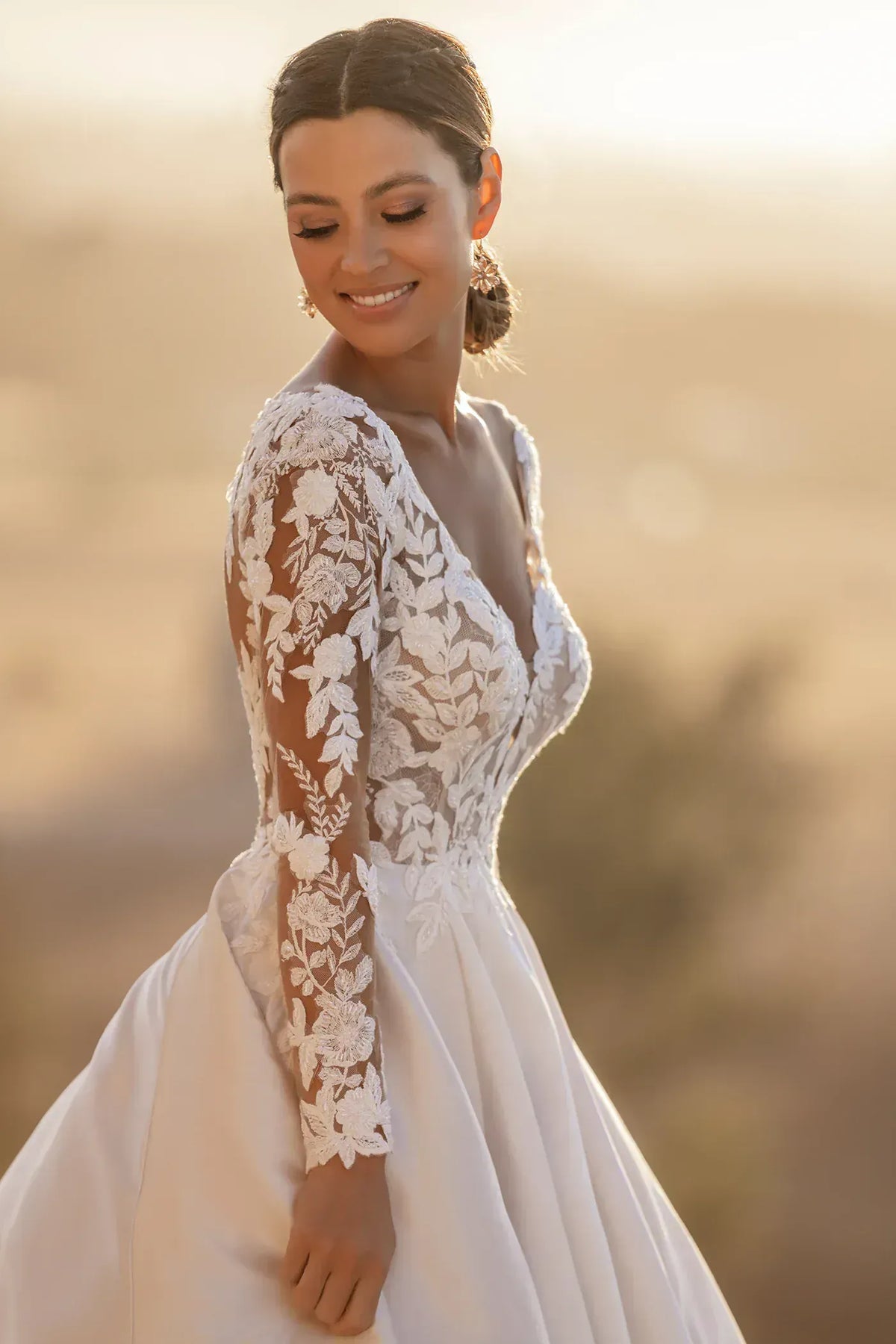 Allure A1105 is a stunning mikado ball gown featuring a beaded lace bodice with long sleeves! This gown comes to us in good condition from a designer boutique. There are spots on the lining + train. Allure A1105 is Ivory/Champagne/Nude in color and a size 14.