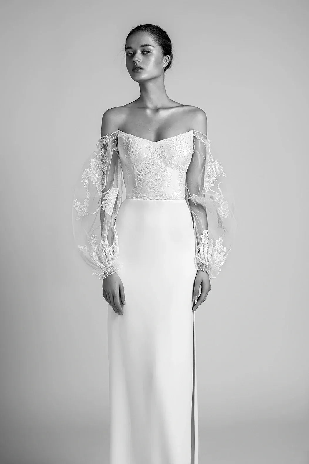 Alon Livné Rita is a striking crepe sheath wedding dress featuring a cat-eye bodice + off-the-shoulder long tulle sleeves! This gown comes to us in great condition from a designer boutique. Alon Livné Rita is Ivory in color and a size 10.