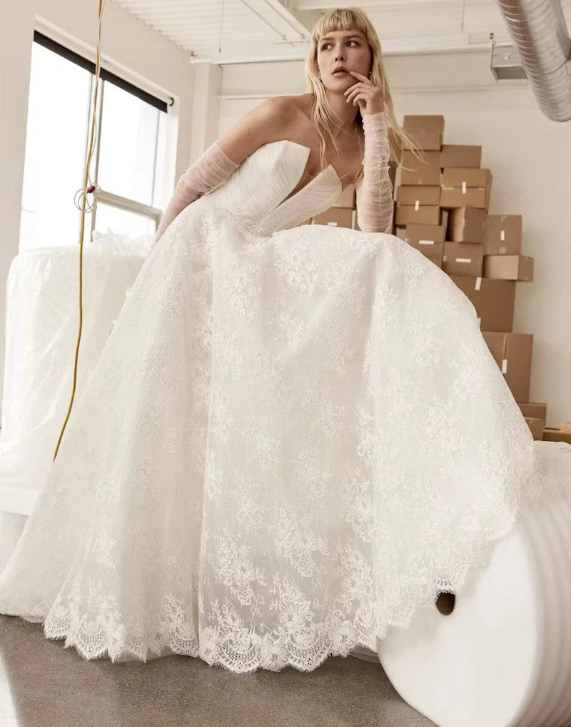 Your bridal gown size differs from your typical dress or pant size! We recommend ordering a sample 2-3 sizes larger than the size you wear in street clothing. For example, if you typically wear a size 12, your bridal size will most likely be a size 16 - 18, depending on the fit + designer. Please note, every designer runs different!