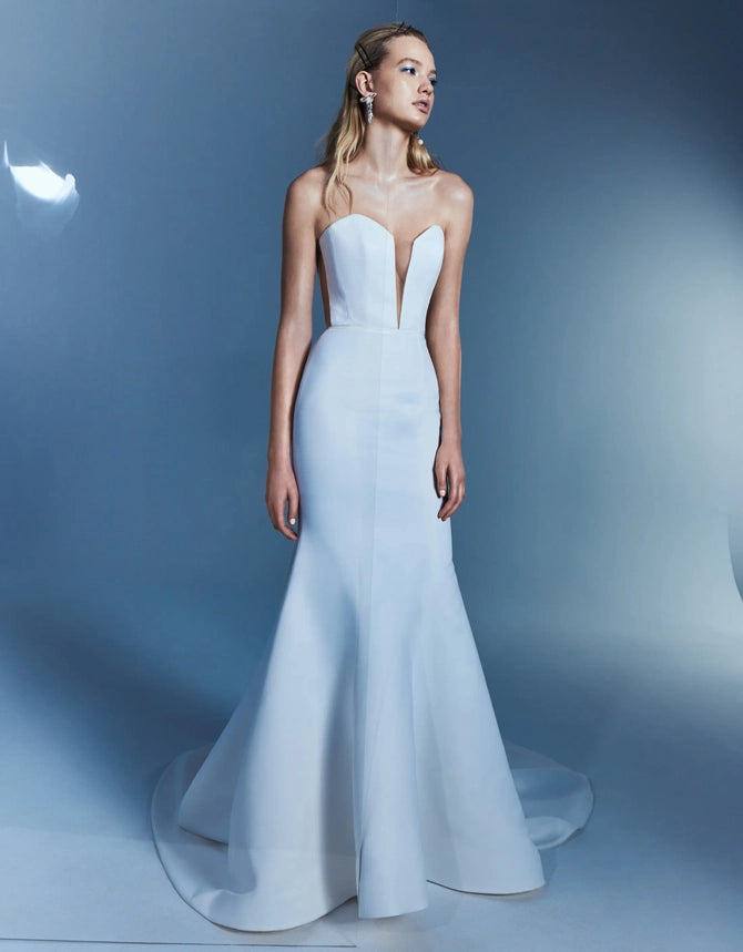 Alyne Londyn is a striking matte satin fit and flare wedding dress showcasing a deep sweetheart neckline + a detachable bow at the back! This gown comes to us in great condition from a designer boutique. Alyne Londyn is Ivory in color and a size 6.