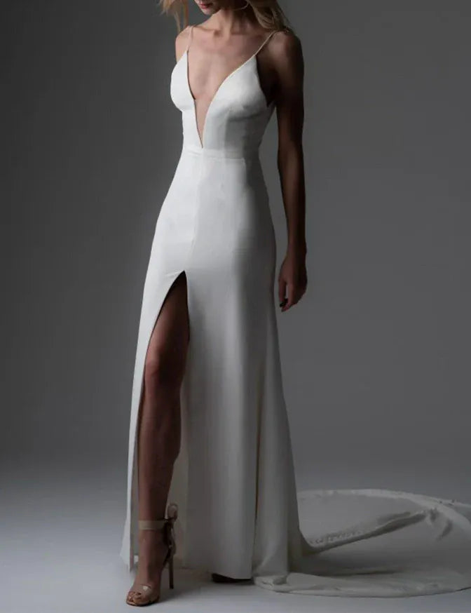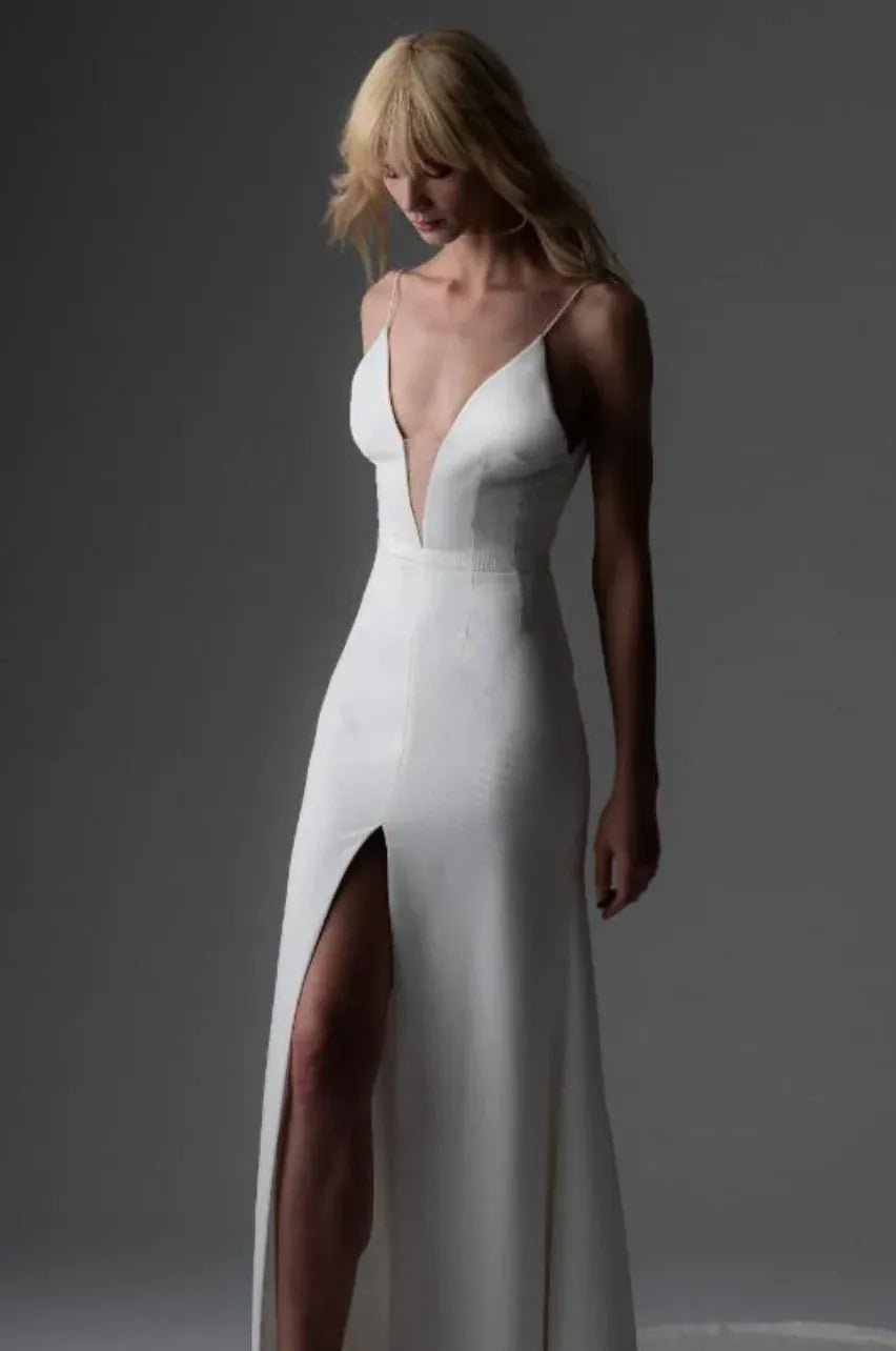 Alyne Georgia is a gorgeous crepe sheath wedding dress featuring a deep V neckline + high slit in the skirt! This gown comes to us in good condition from a designer boutique. There is a spot near the zipper, + minor pilling. Alyne Georgia is Off White in color and a size 10.