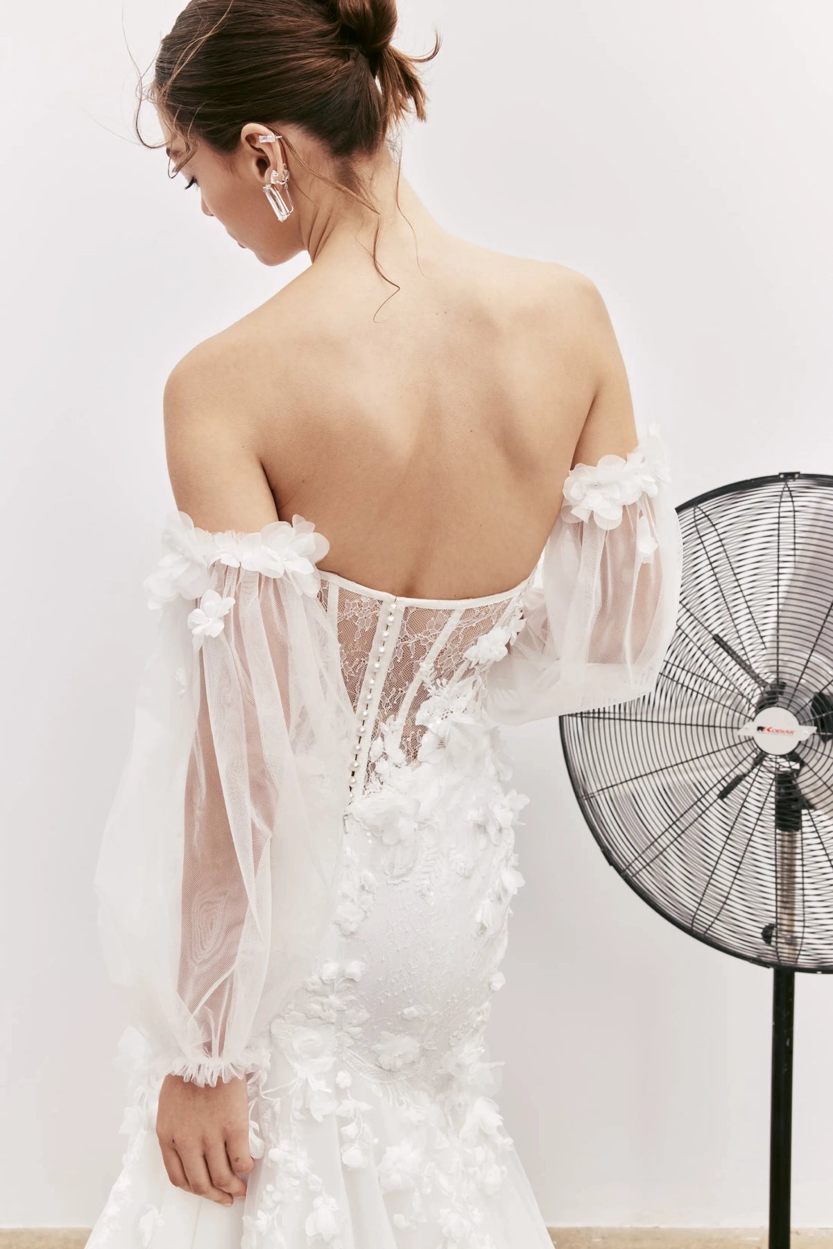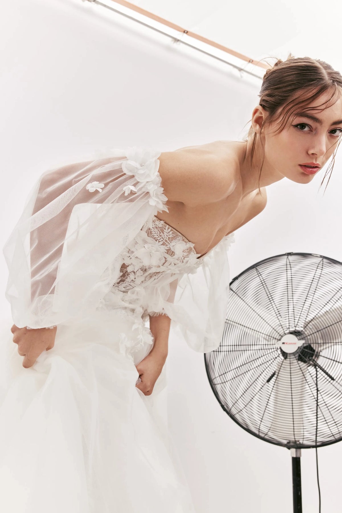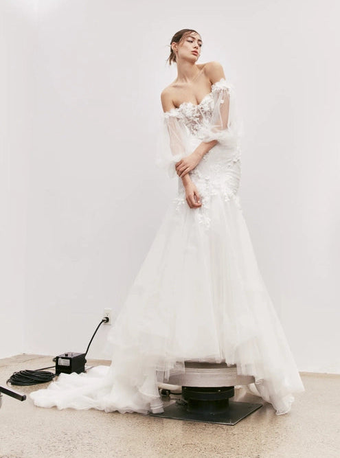 Alyne Jax is a luxurious tulle fit and flare wedding dress featuring floral appliqués + detachable long sleeves! This gown comes to us in great condition from a designer boutique. Alyne Jax is Ivory in color and a size 10.