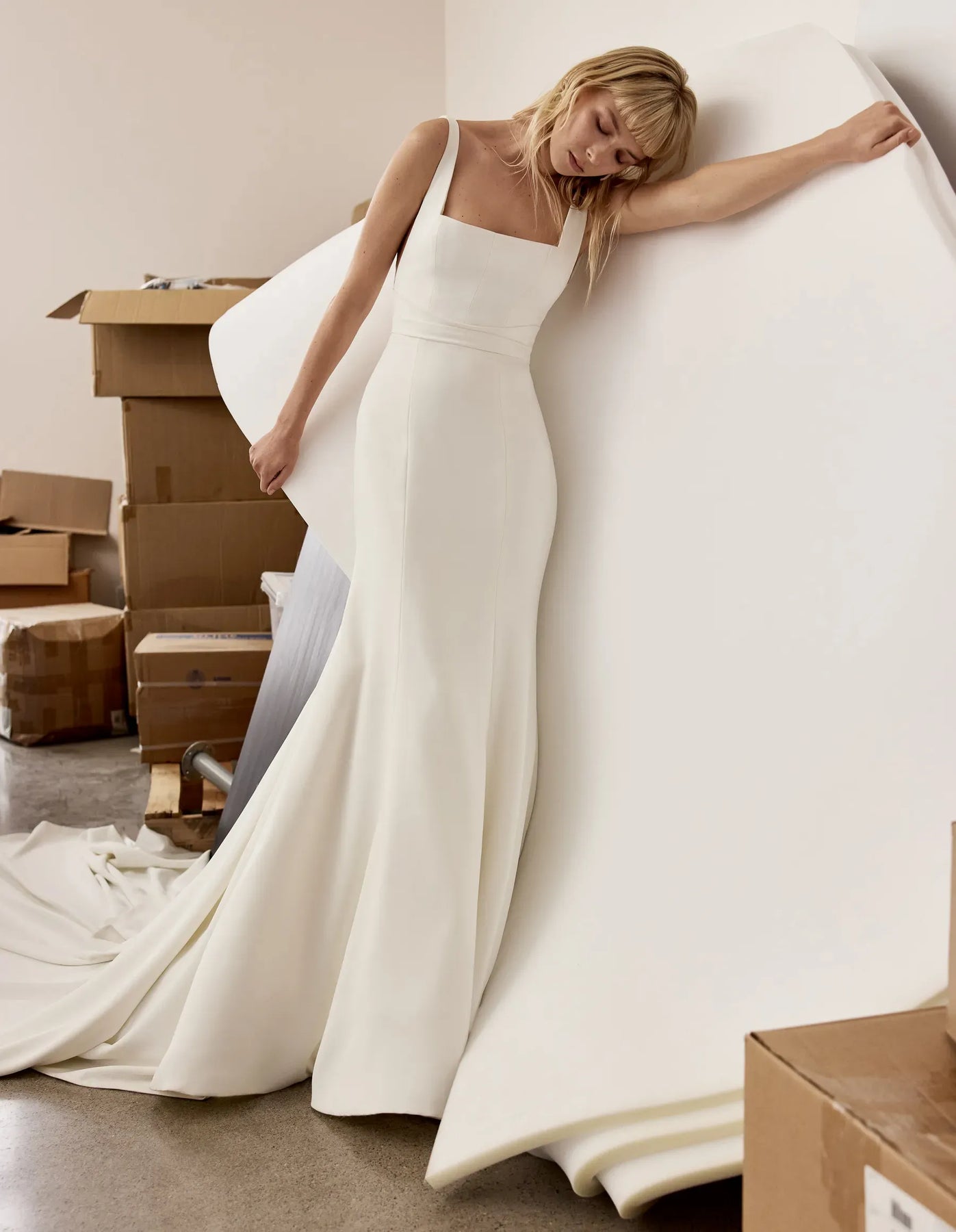 Alyne June is a sultry crepe sheath wedding dress featuring a bow at the back! This gown comes to us in great condition from a designer boutique. Alyne June is Ivory in color and a size 12.