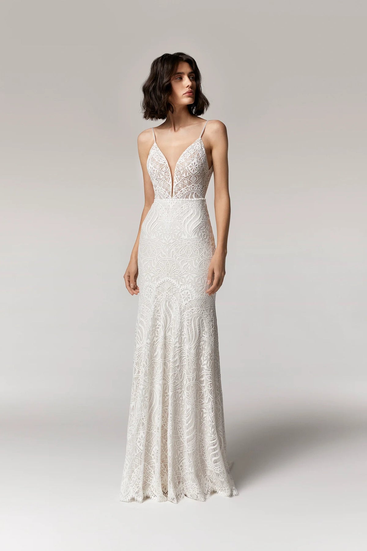 Anna Kara Jade is a bohemian lace sheath wedding dress featuring thin straps that cross over the back! This gown comes to us in great condition from a designer boutique. There is a loose bead on the belt. Anna Kara Jade is Ivory/Nude in color and a European size 42, which fits like a US size 10.