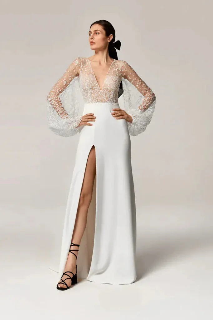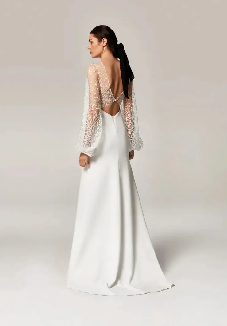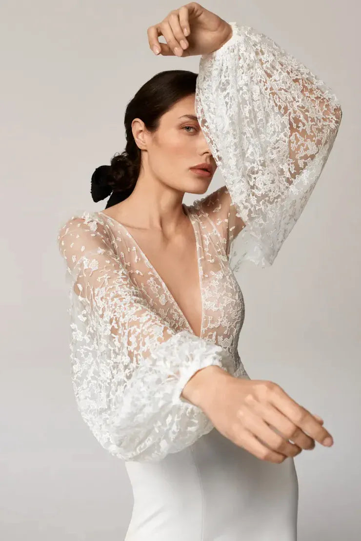 Anna Kara Jolene is a stunning crepe sheath wedding dress featuring a lace bodice with billowing long sleeves! This gown comes to us in great condition from a designer boutique. Anna Kara Jolene is Ivory in color and a European size 42, which fits like a US size 10.