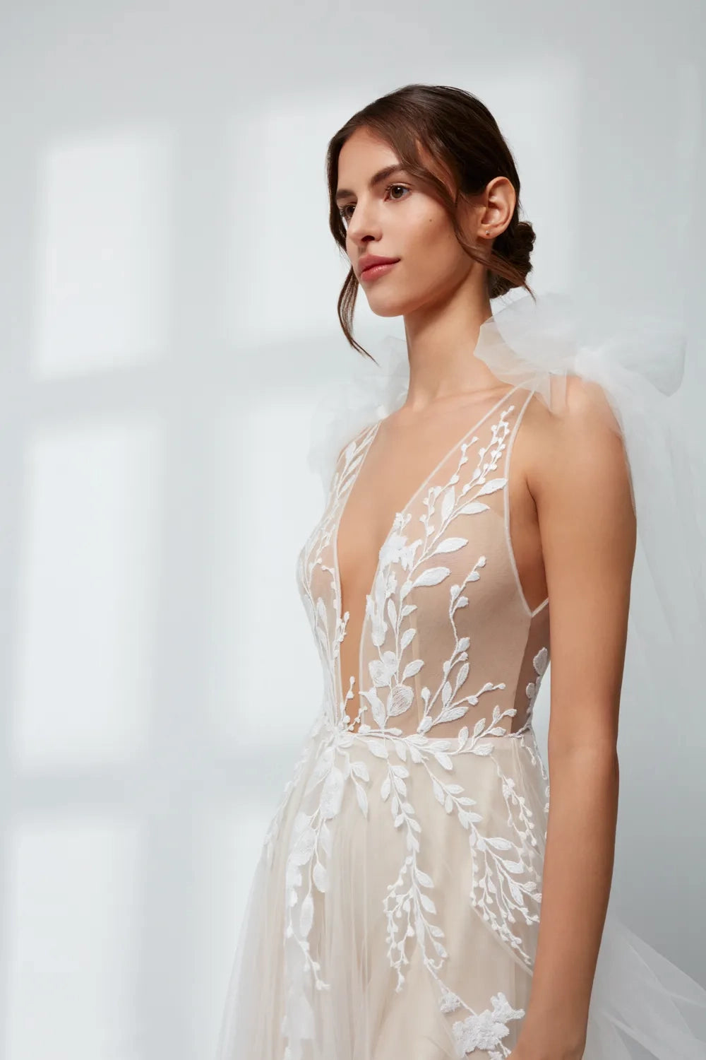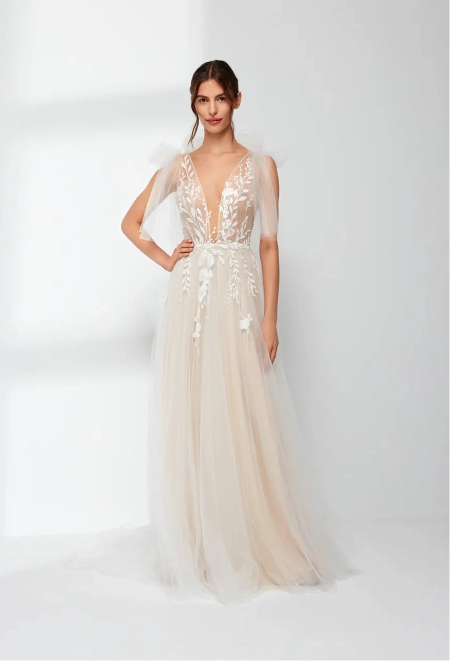 Anna Kara Marit is an airy tulle A-line wedding dress featuring tulle bows at the shoulders + floral appliqués! This gown comes to us in great condition from a designer boutique. Anna Kara Marit is Ivory/Nude in color and a European size 40, which fits like a US size 8.