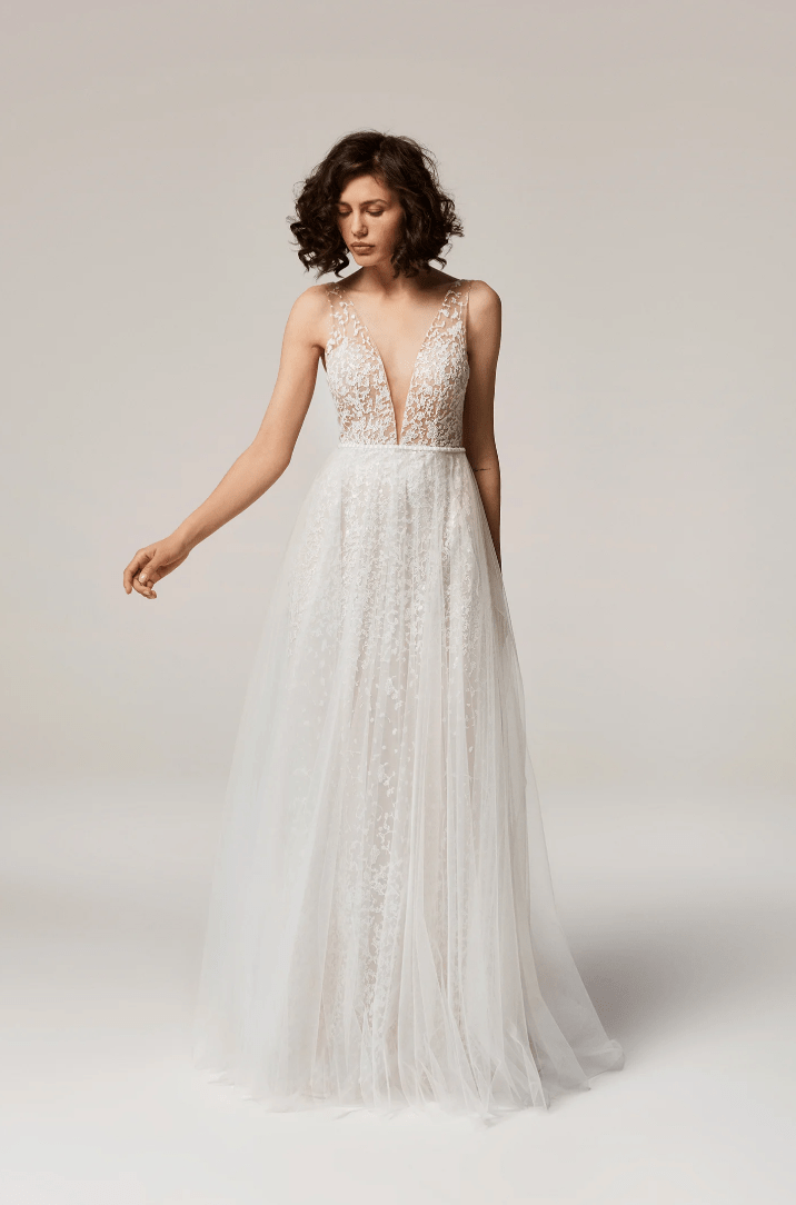 Anna Kara Sarita is a lovely tulle A-line wedding dress featuring sequined embroidery throughout! The bodice has a plunge neckline. This gown comes to us in great condition from a designer boutique. Anna Kara Sarita is Ivory/Nude in color and a European size 40, which fits like a US size 8.