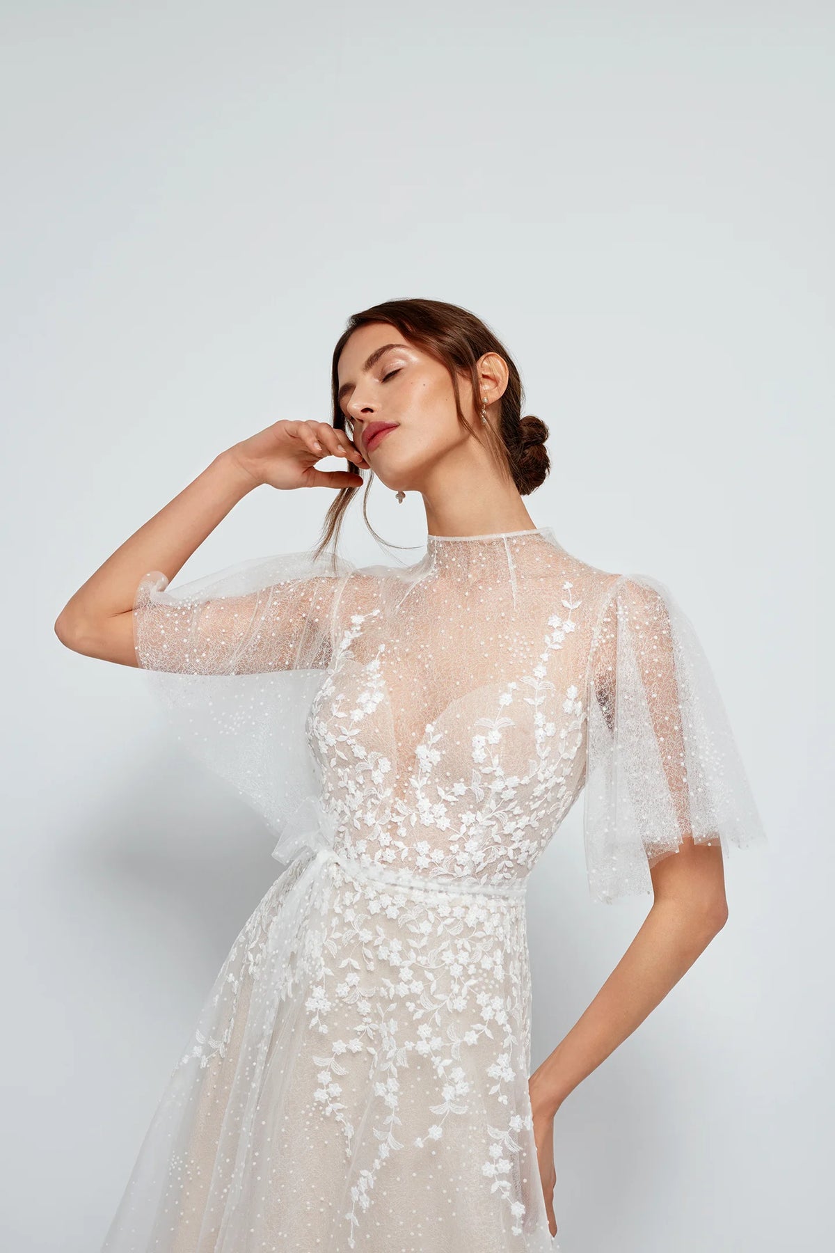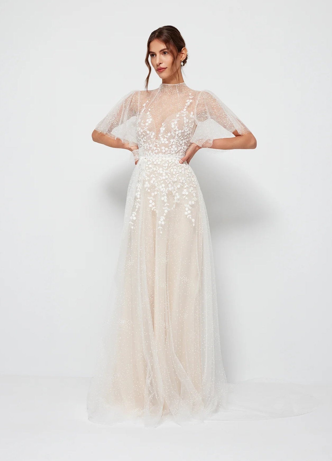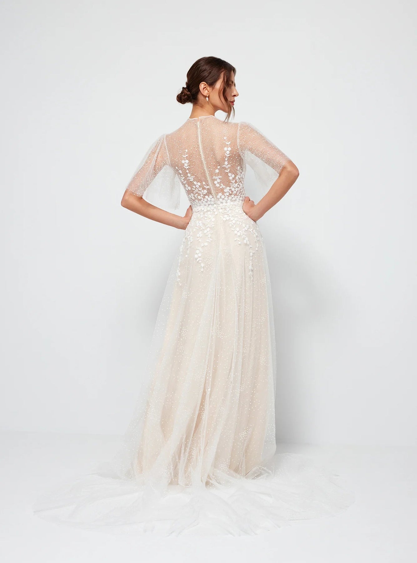 Anna Kara Skade is a gorgeous tulle A-line wedding dress featuring floral appliqués + fluttery sheer sleeves! Please note, our gown has a lined bodice + boning. This gown comes to us in great condition from a designer boutique. Anna Kara Skade is Ivory/Nude in color and a European size 40, which fits like a US size 8.