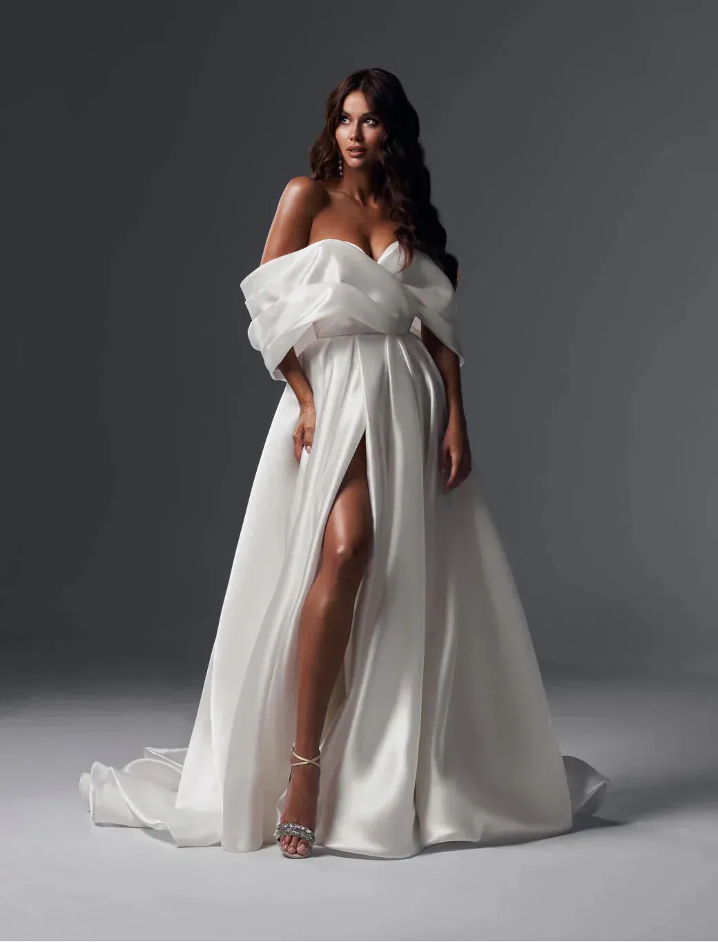 Anna Sposa Mirari is a dreamy satin A-line wedding dress featuring detachable off-the-shoulder sleeves + a high slit in the skirt! This gown comes to us in great condition from a designer boutique. Anna Sposa Mirari is White in color and a European size 36, which fits like a US size 4.