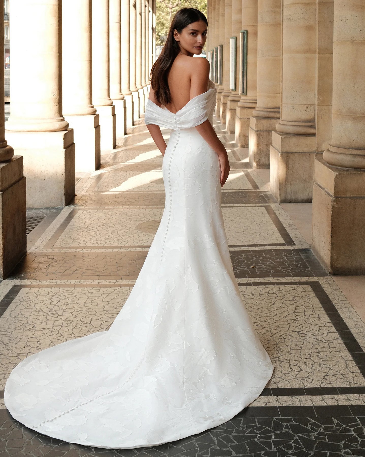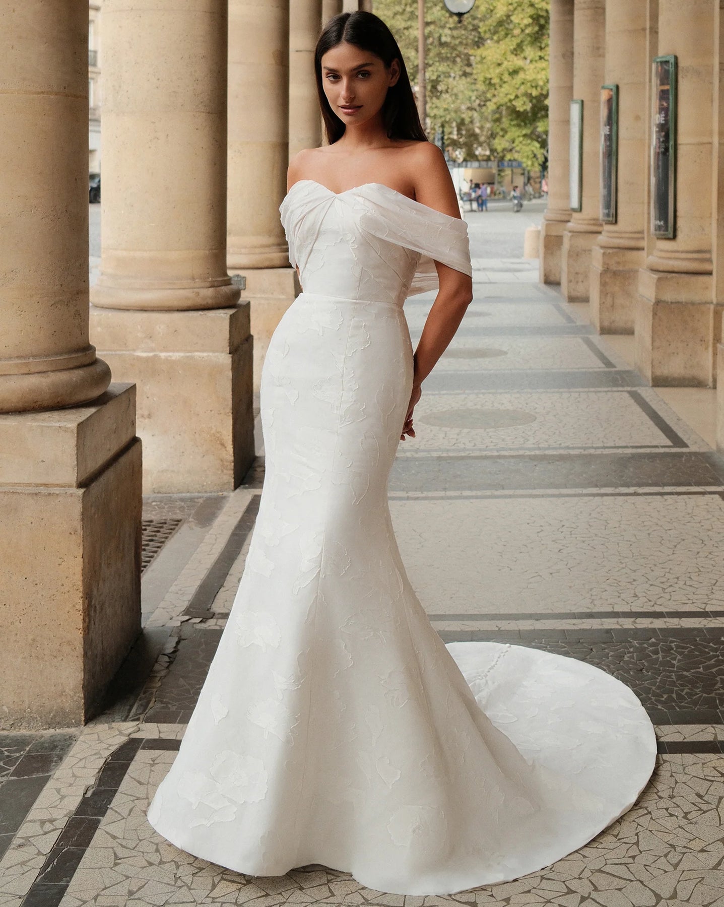 Antonio Gual Poppy is a luxurious cotton fil coupe fit and flare wedding dress featuring an off-the-shoulder drape on the bodice! This gown comes to us in great condition from a designer boutique. Antonio Gual Poppy is Ivory in color and a size 2.