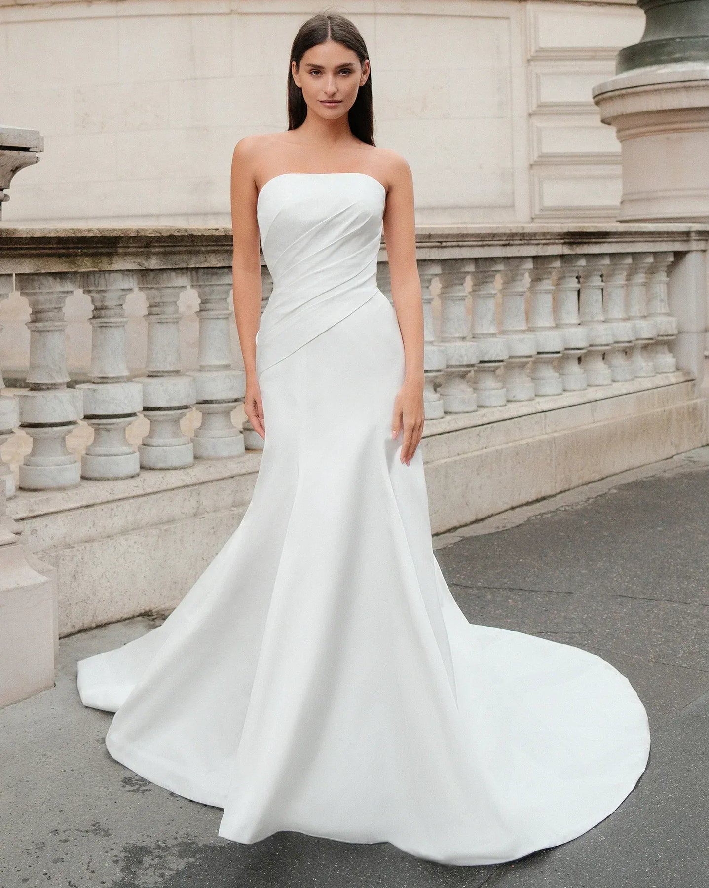 Antonio Gual Zan is a bold satin fit and flare wedding dress featuring a strapless ruched bodice with a straight neckline! This gown comes to us in good condition from a designer boutique. There are minor spots + boutique dust. Antonio Gual Zan is Ivory in color and a size 2.
