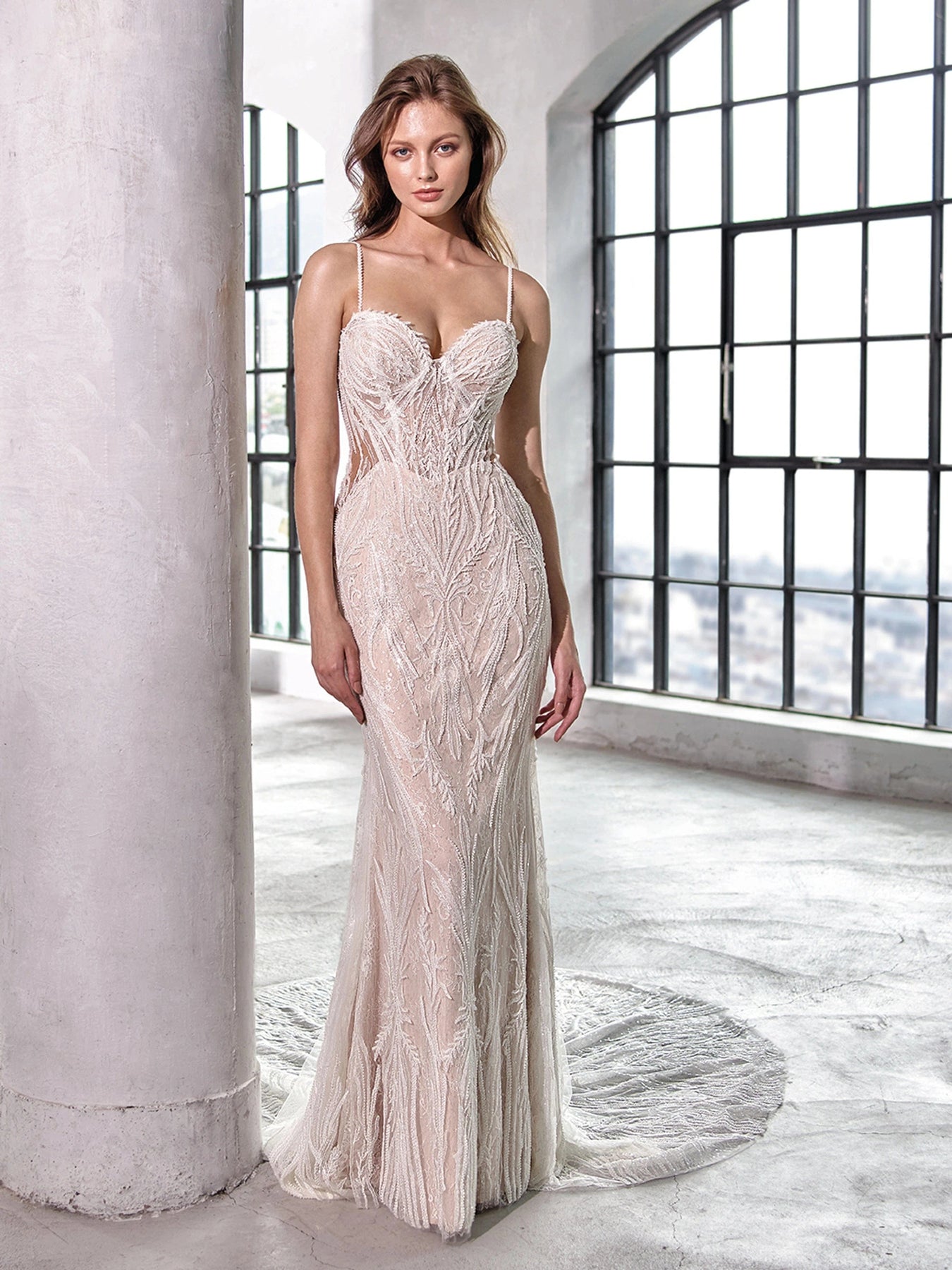 Badgley Mischka Fabiana is a striking beaded lace sheath wedding dress featuring a sculpted sweetheart bodice + short train! This gown comes to us in good condition from a designer boutique. There are loose threads/beads. Badgley Mischka Fabiana is Ivory/Nude/Nude in color and a size 12.
