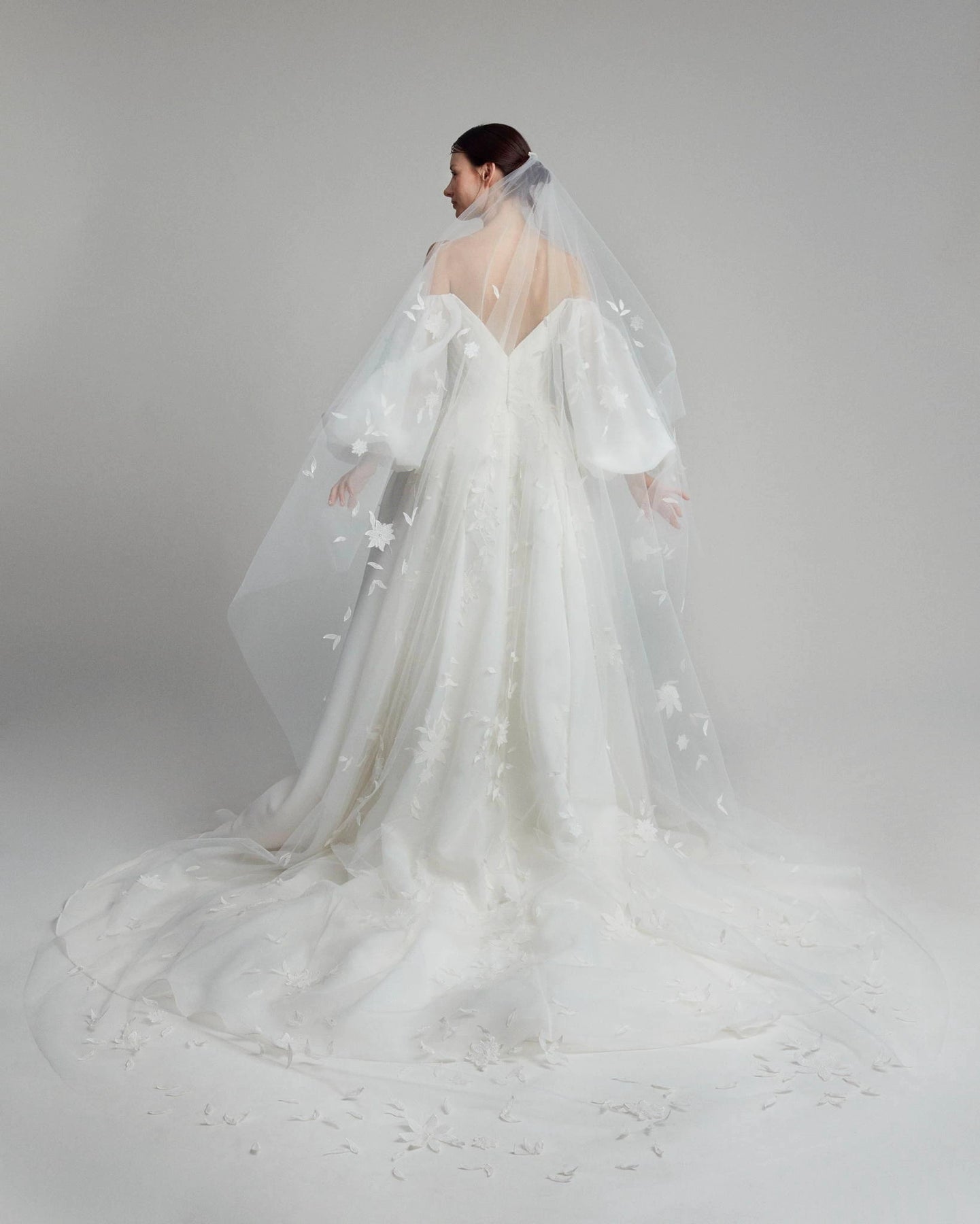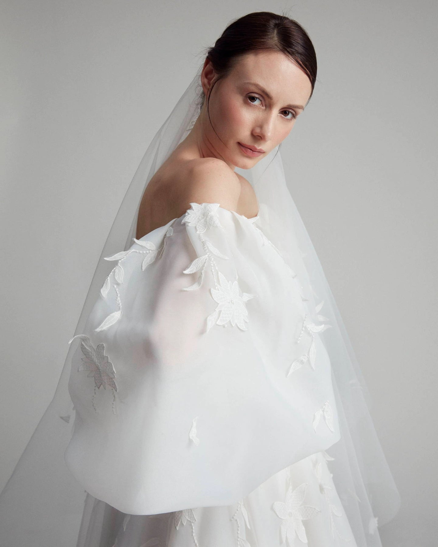Beccar Couture Marley is a stunning organza ball gown featuring floral motifs + off-the-shoulder long sleeves! This gown comes to us in good condition from a designer boutique. Cleaning needed on underarms + train. Beccar Couture Marley is Ivory in color and a size 12.