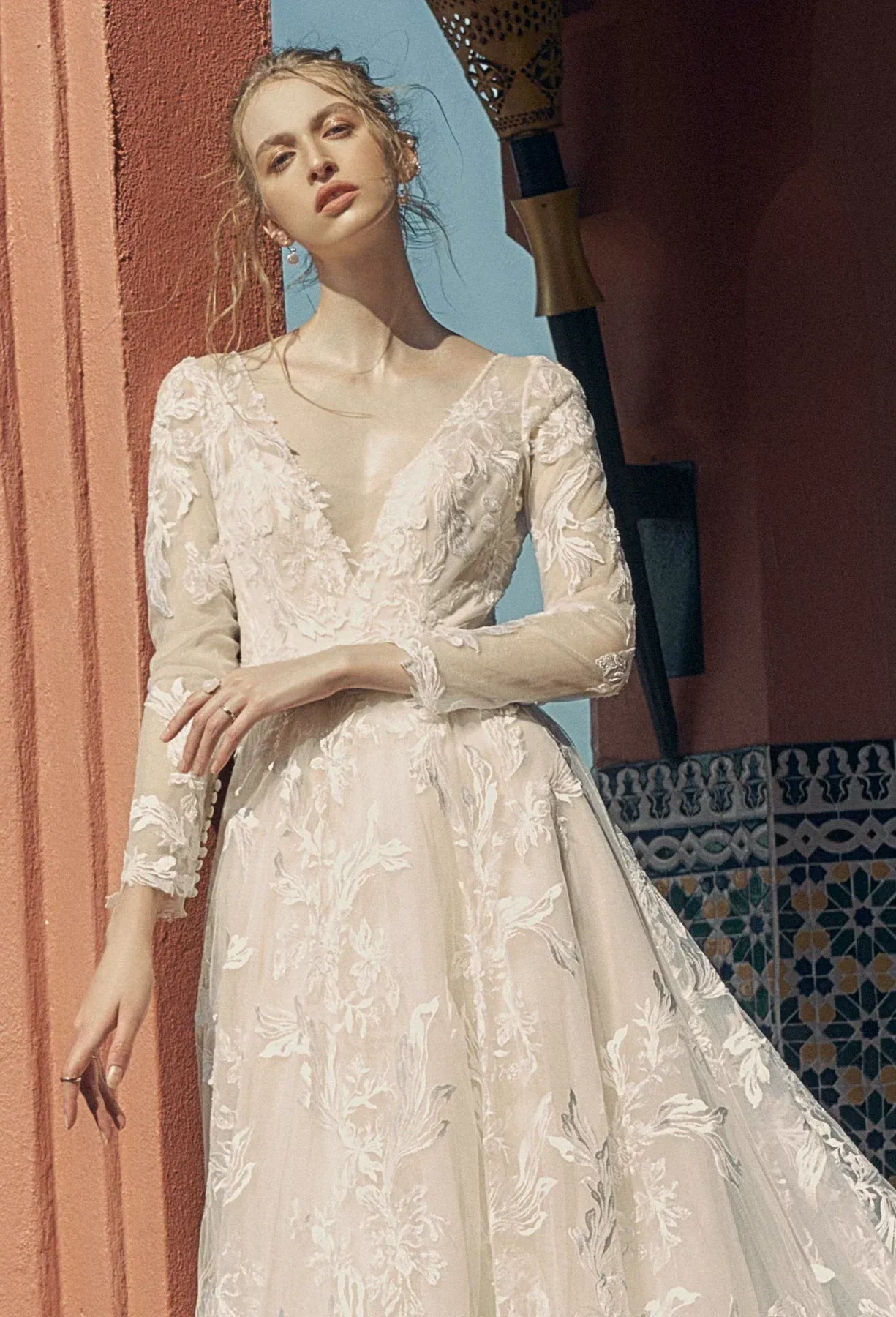 Beccar Kamila is a gorgeous lace A-line wedding dress featuring a V neckline, long sleeves, + chapel-length train! This gown comes to us in fair condition from a designer boutique. There is boutique dust, some oxidized beads, + loose threads. Beccar Kamila is Nude in color and a size 4.