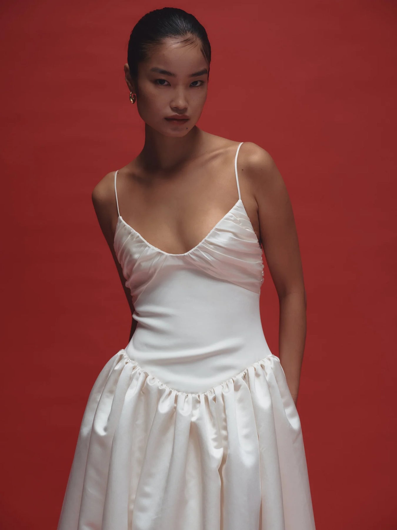 Besa Bridal Lydia is a modern satin A-line wedding dress featuring a drop waist + ruched neckline! This gown comes to us in good condition from a designer boutique. The straps need cleaned, + there is a spot near the zipper. Besa Bridal Lydia is Off White in color and a size 10.
