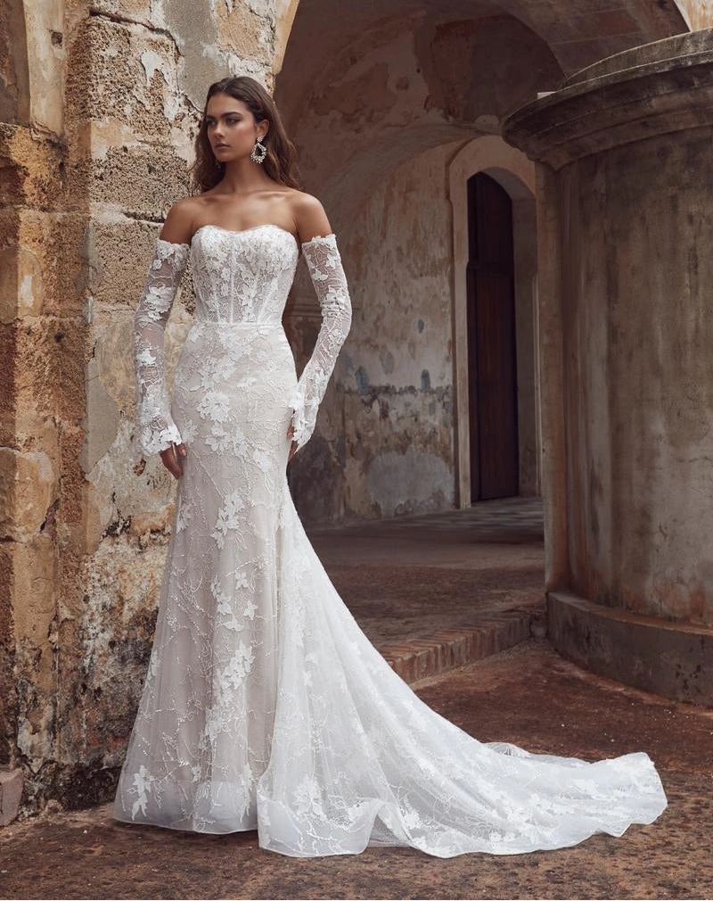 Calla Blanche 123125 is a lovely lace fit and flare wedding dress featuring a sweetheart neckline! Please note, the sleeves pictured are NOT included. This gown comes to us in great condition from a designer boutique. Calla Blanche 123125 is Ivory/Light Nude in color and a size 14.