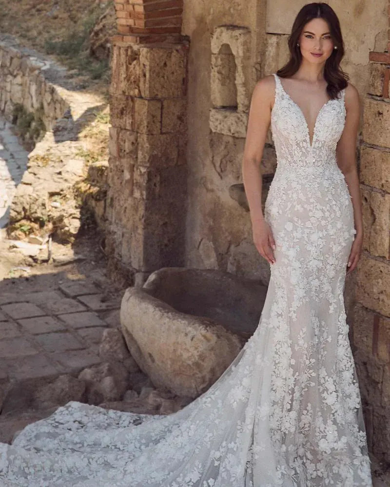 Calla Blanche 125116 Rose is a beautiful lace sheath wedding dress featuring dimensional floral laces! This gown comes to us in great condition from a designer boutique. Calla Blanche 125116 Rose is Ivory/Nude in color and a size 12.