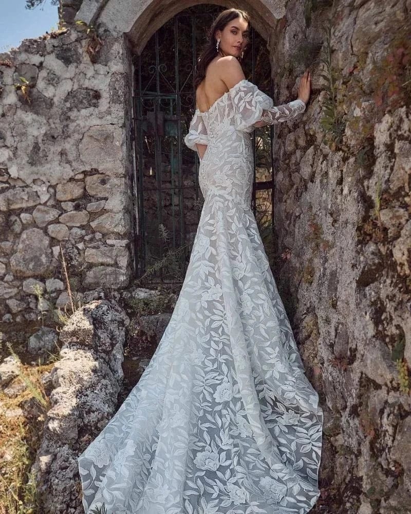 Calla Blanche Bela is a romantic lace fit and flare wedding dress featuring detached long sleeves! This gown comes to us in great condition from a designer boutique. There is a frayed hanger strap. Calla Blanche Bela is Ivory/Ivory in color and a size 16.