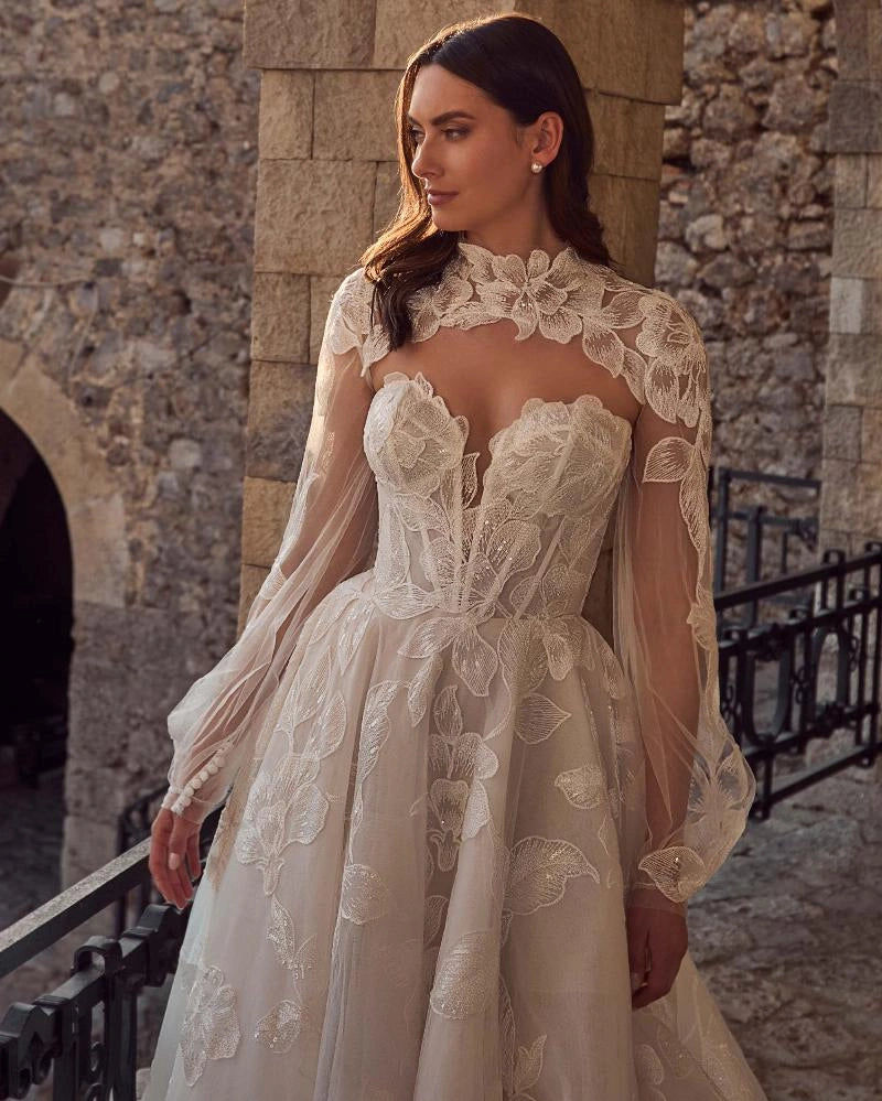 Calla Blanche Dalia 125101 is a dazzling ball gown accented with sparkly lace florals + a detachable long sleeve jacket! This gown comes to us in great condition from a designer boutique. Calla Blanche Dalia 125101 + Jacket is Ivory/Mocha in color and a size 12.