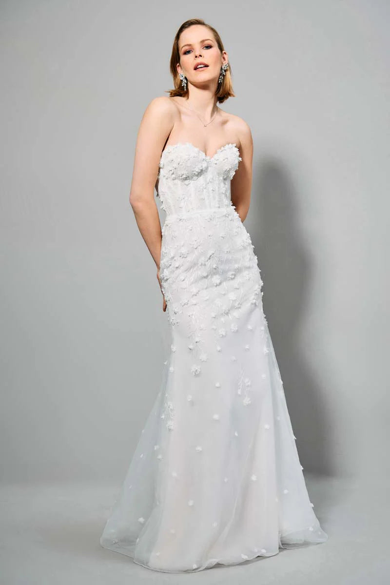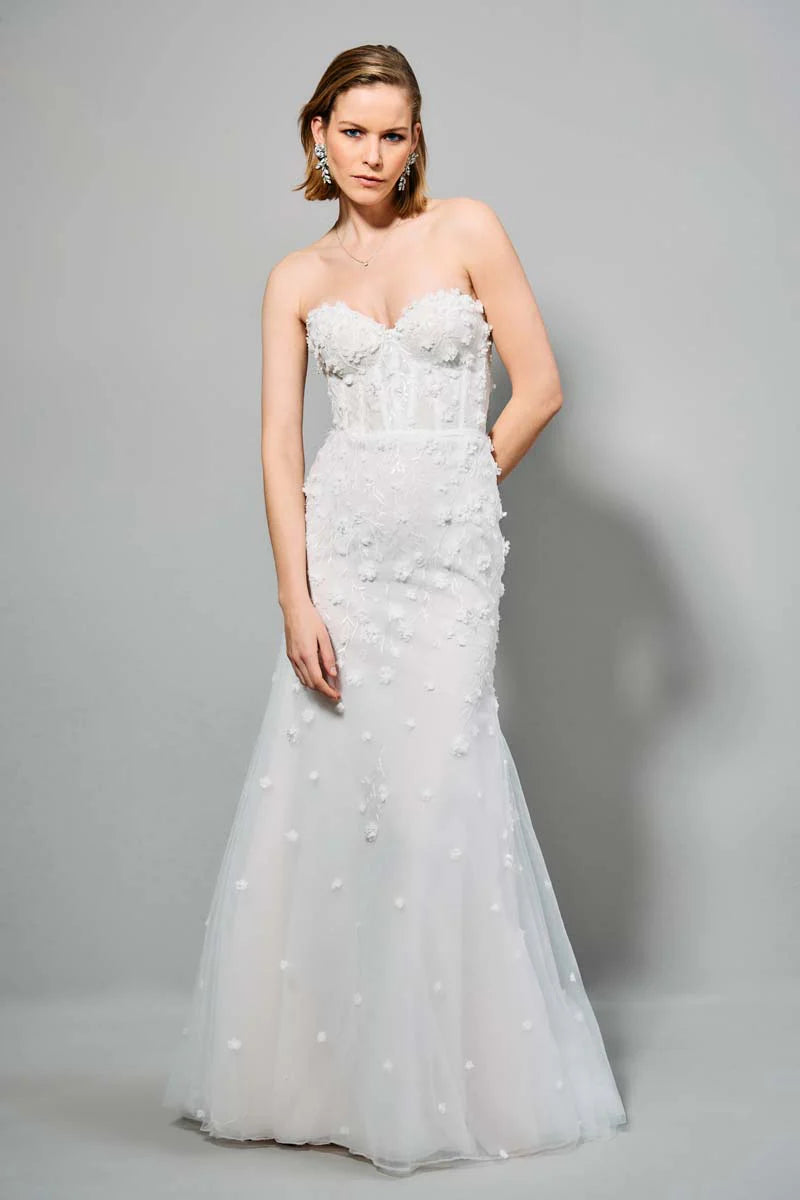 Caroline Castigliano Celebrity is a glamorous tulle sheath wedding dress embellished with dimensional florals! This gown comes to us in great condition from a designer boutique. Caroline Castigliano Celebrity is Ivory/Blush in color and a size 13.