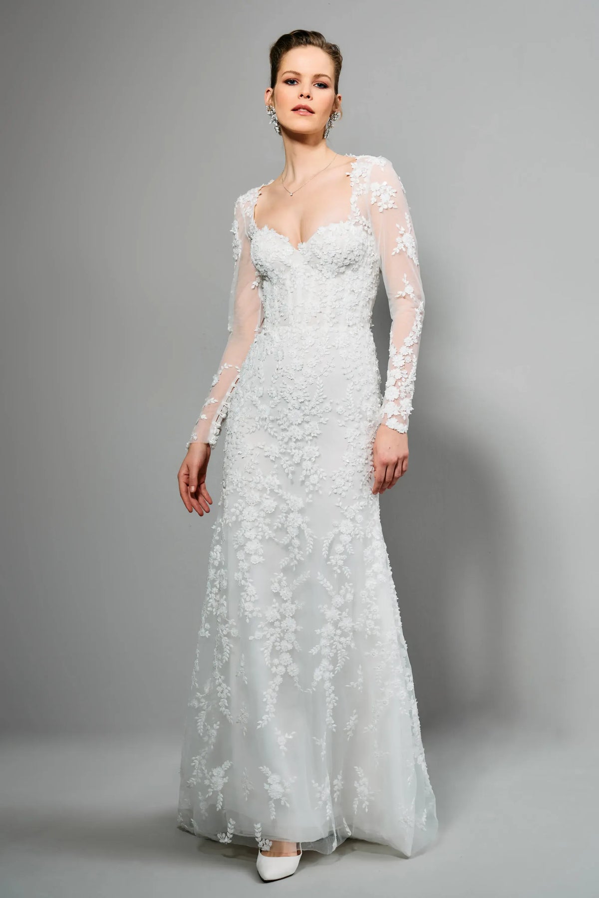 Caroline Castigliano Shaftesbury is a glamorous beaded lace sheath wedding dress featuring sheer long sleeves that frame the sweetheart neckline! This gown comes to us in great condition from a designer boutique. Caroline Castigliano Shaftesbury is Ivory in color and a size 14.
